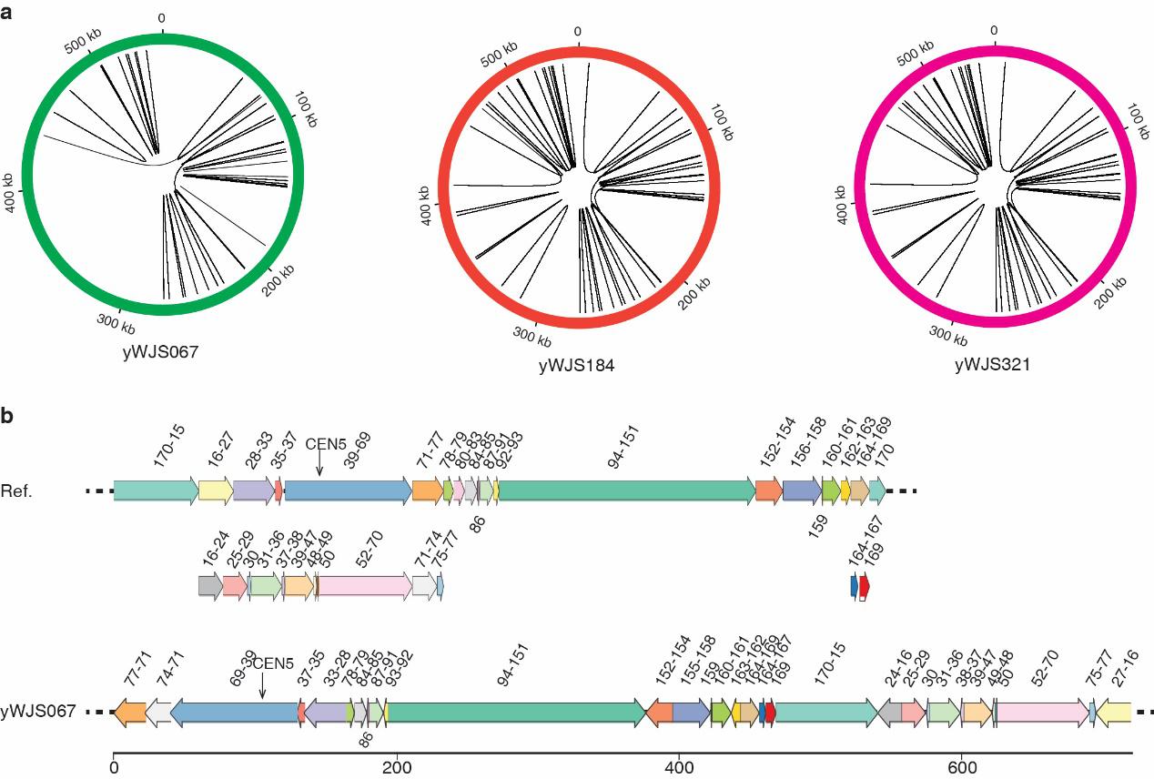 研究人员选择了抗癌活性化合物——紫色杆菌素前体物(PDV)作为目标性状,通过多轮基因组重排来探究染色体结构变异对细胞功能的影响。研究发现,环形染色体基因组重排过程中会连续产生复杂的基因组结构变异和表型优化。环形染色体的重排后,发现了1、3、6、12、13和环形5号染色体的数目加倍,形成染色体非整倍体酵母菌株。重排使染色体自身产生更多的非对称性结构变异,包括DNA片段的重复和片段插入;经过5次连续诱导重排后,所获得环形染色体的长度比原始染色体增加了一倍以上。