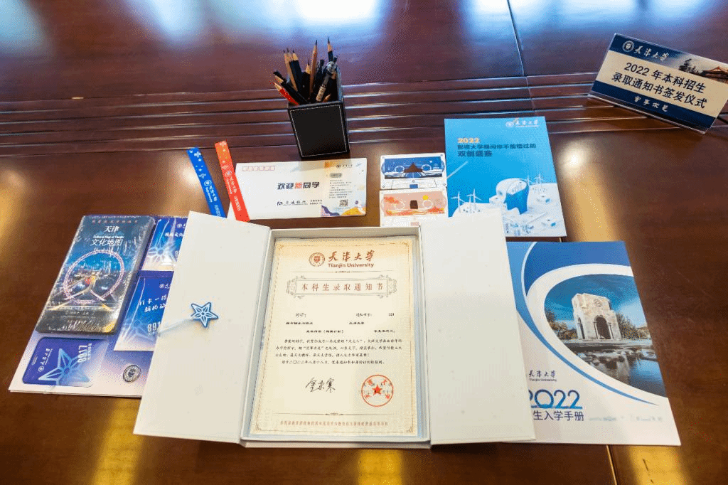 “用你的温度开启你的热爱”,启封在开合处温感变色的“天津大学星”,还有更多惊喜。通知书套盒内装有录取通知书、冯骥才先生主编《天津文化地图》、“天大之星”校园卡套、天大校徽、天大纪念卡、“校园文化地图”、“天津大学本科生新生入学手册”等等。2.0版的通知书套装针对不同校区的新生,内装材料进行分别定制,可谓心意满满。同学们可以在通知书中充分感受到第一所现代大学的历史文化之美和天津城市魅力,仔细看过通知书后对未来的大学生活更加期待。