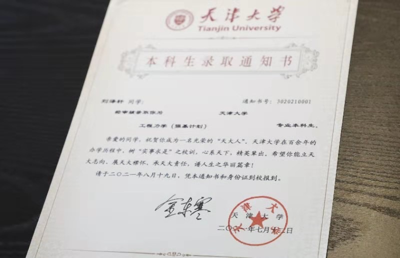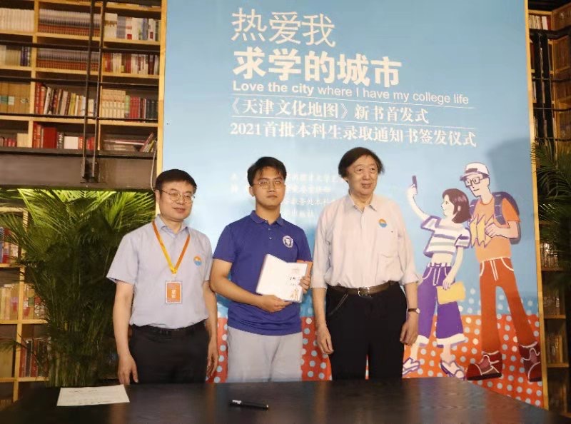 本站讯(记者 刘晓艳 通讯员 杨扬 卢旭 摄影 唐蒙)天津大学本科新生代表刘泽轩在7月12日这天成为了“幸运儿”。当天,他不仅领到了金东寒校长亲笔签发的天津大学2021年“0001”号录取通知书。更幸运的是,这份录取通知书大礼包里还有一份神秘礼物:由冯骥才先生现场签名的《天津文化地图》。