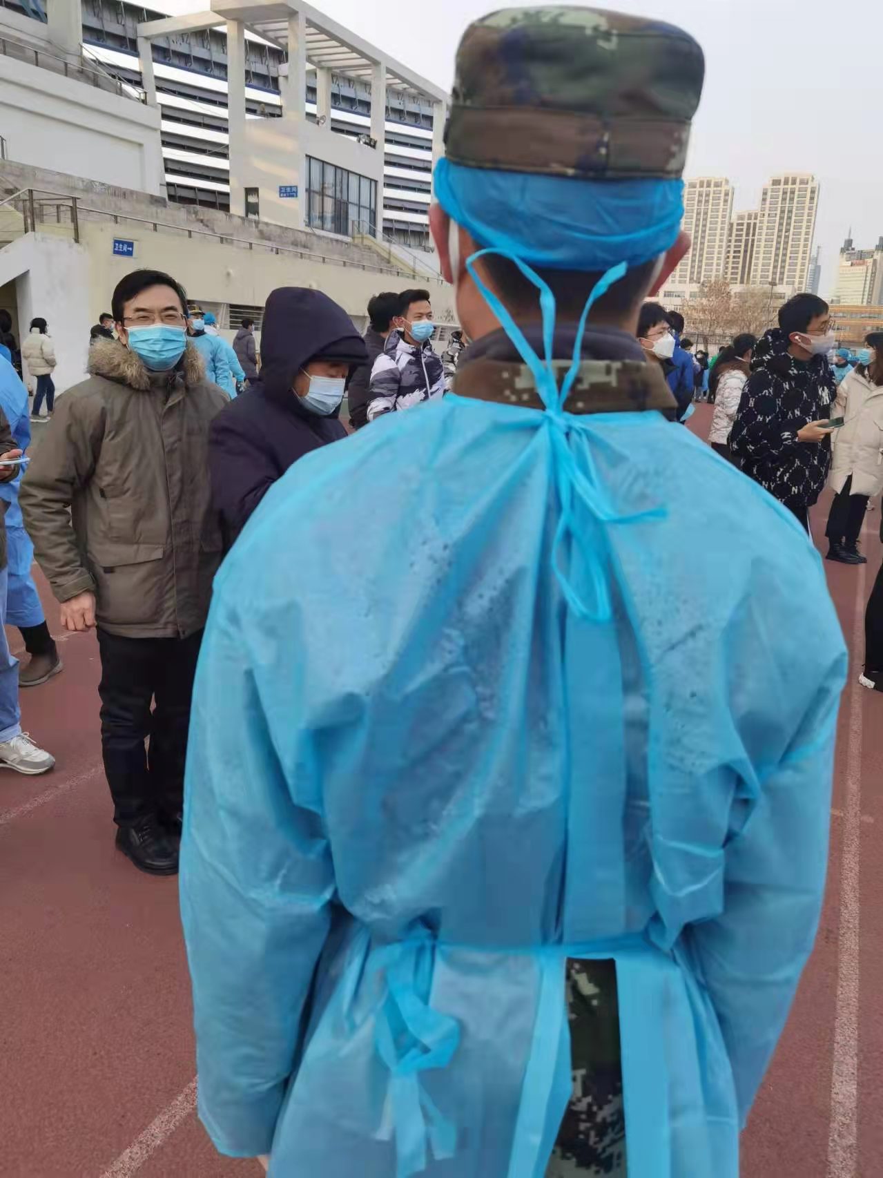 腊月刺骨的寒风中,很多志愿者厚实的迷彩工作服已经被汗水浸透,防护服上留下了大片大片的水雾和汗珠。