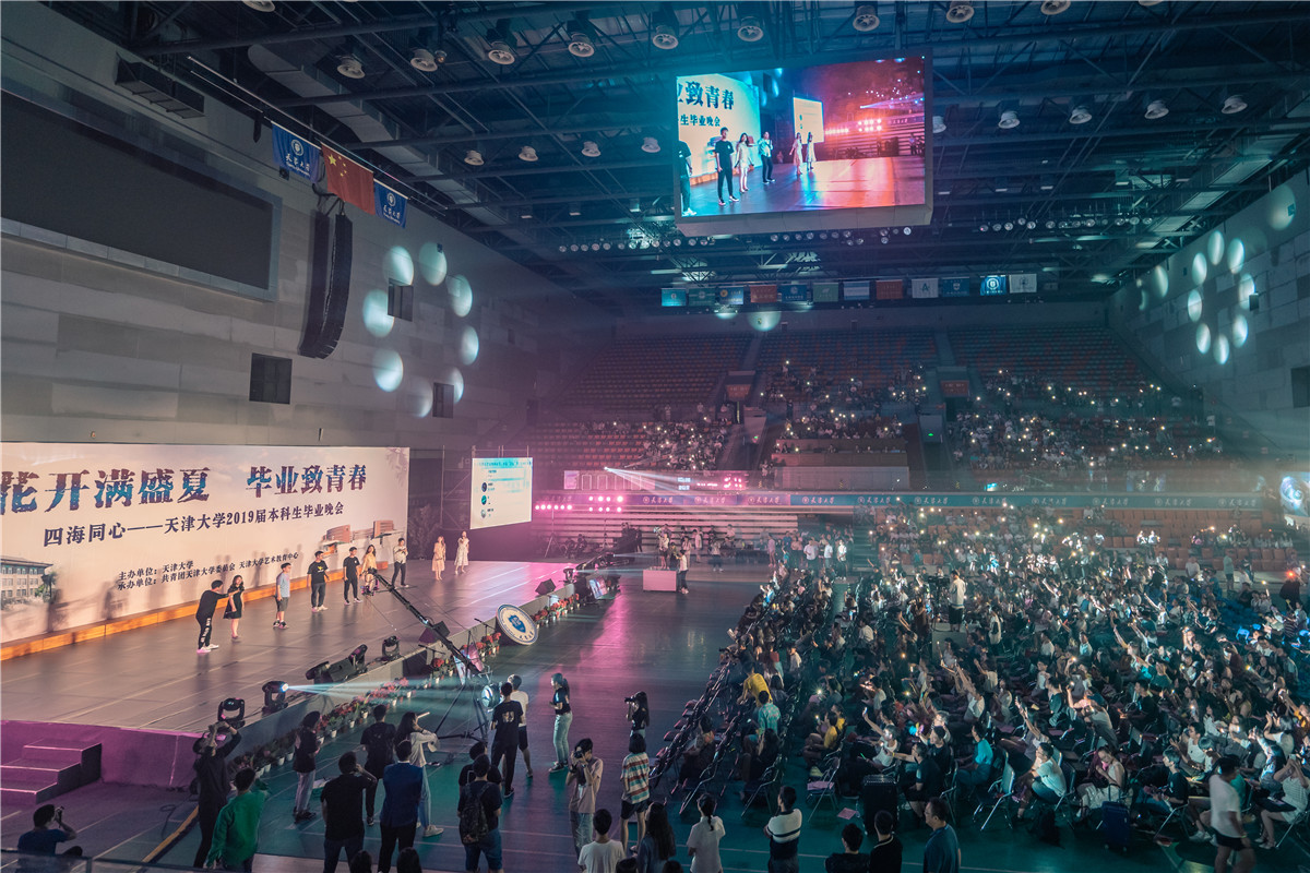 2019年6月30日晚,“花开满盛夏,毕业致青春”四海同心——天津大学2019届本科生毕业晚会在卫津路校区体育馆拉开帷幕。本次晚会到场嘉宾有天津大学党委副书记雷鸣,天津大学驻村工作组组长、付家村第一书记刘东海,兰州交通大学团委书记张利峰,天津大学党委学工部部长赵欣,校团委书记吕静,保卫处处长袁惠龙,保卫处副处长袁全,场馆中心主任王鑫,党委学工部副部长马德刚,党委学工部副部长柳丰林,党委宣传部副部长王鑫,校团委副书记赵剑博,校团委副书记刘佳,以及与同学们朝夕相伴的各学院副书记、辅导员老师们。