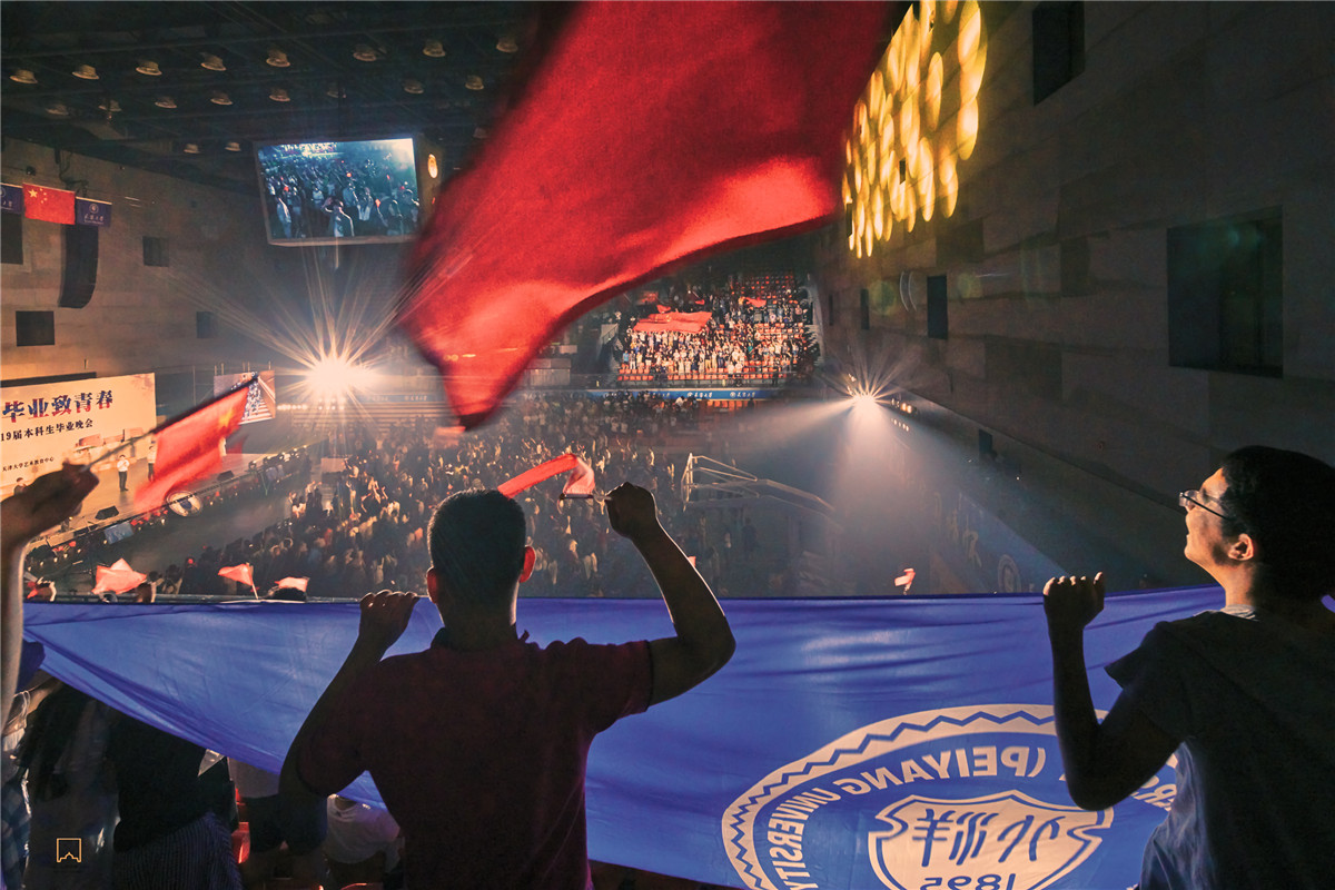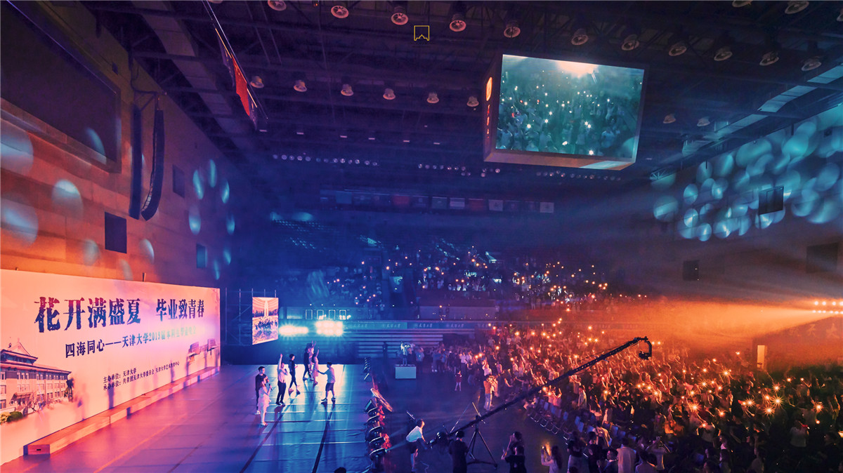 毕业歌会同学们动情演唱共同追忆大学生活,千人合唱《我和我的祖国》和《天津大学校歌》,五星红旗和天大校旗在观众席两侧红色的海洋中交相呼应,熠熠生辉。