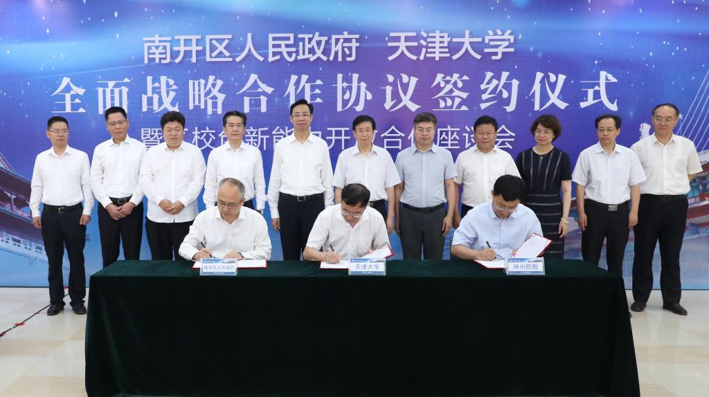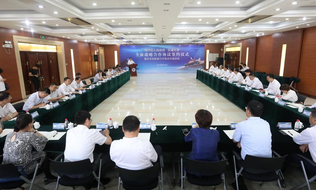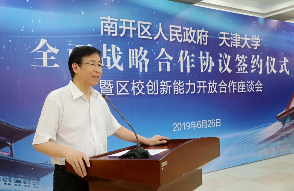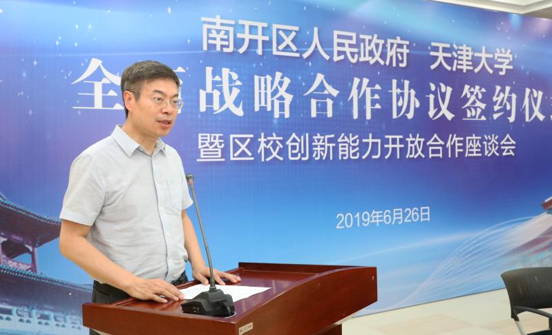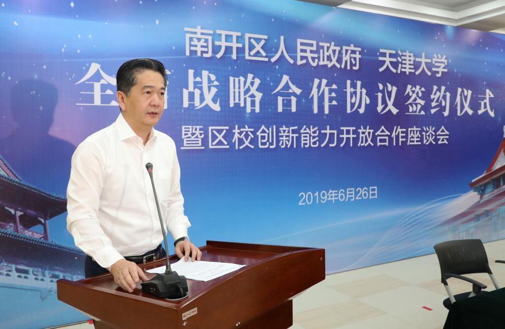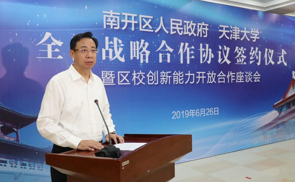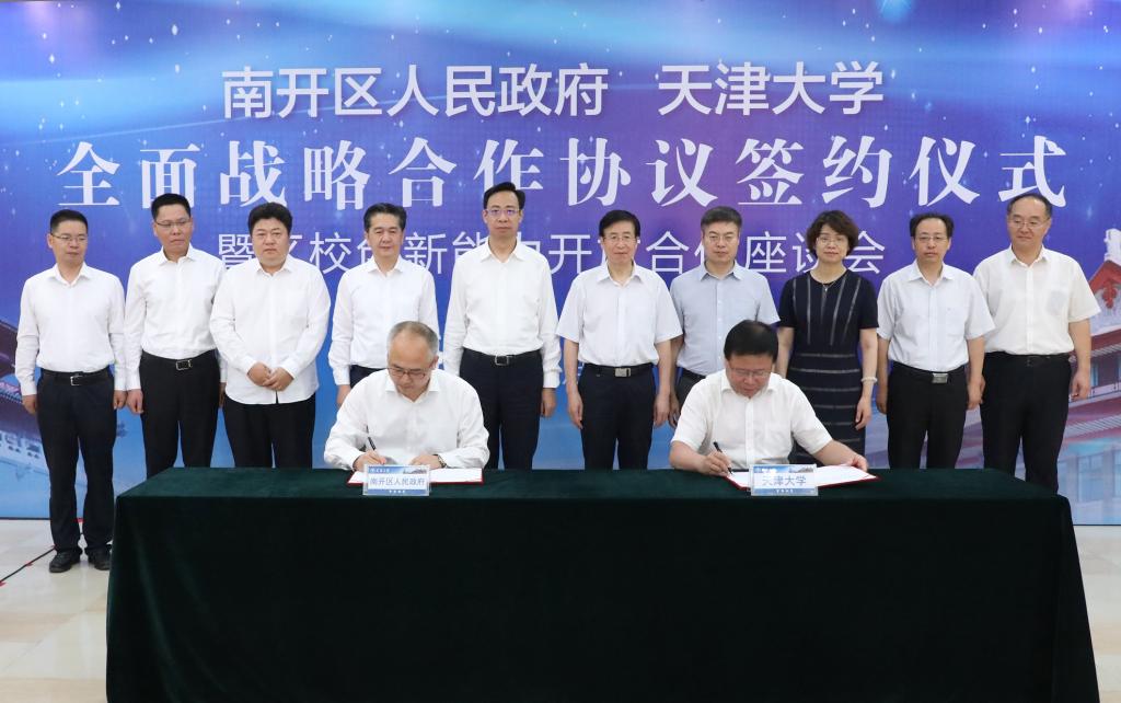 成果应用示范以及高层次人才培养等方面开展全面战略合作。南开区区委书记杨兵,南开区区委副书记,区长孙剑楠,南开区区委副书记、统战部长敖立功、南开区副区长罗进飞;天津大学党委书记李家俊,天津大学校长、中国工程院院士金东寒,天津大学党委常委、副校长元英进,天津大学党委副书记雷鸣、天津大学党委常委、副校长王树新、天津大学校长助理刘宁和南开区政府、天津大学相关部门负责人出席签约仪式,天津大学副校长张凤宝主持签约。