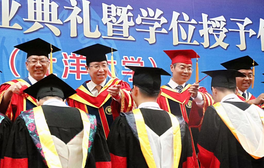 典礼结束前,全体毕业生高唱校歌。随后,现场的毕业生依次走上主席台,由校领导、学位委员会委员代表为他们授予学位、拨动流苏。