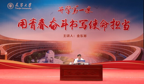 “何为大学的时代使命?”金东寒从中国大学之道、高教的发展要求、天大时代使命三个方面阐述了大学的时代使命。服务国家发展需求是大学的使命,是高等教育的职责,中国高等教育的发展始终是与国家命运和国家需求紧密结合在一起的。“兴学强国的使命、实事求是的校训、严谨治学的校风、爱国奉献的传统、矢志创新的追求”是天大品格的核心表达,金东寒借以勉励新生,希望大家“既要勇于承担时代的责任,也要不断磨练自己担当的本领,与祖国的发展同频共振!”