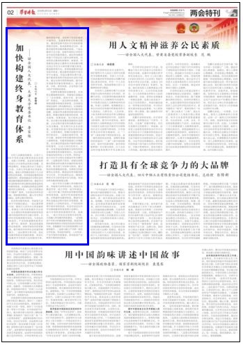 优化终身教育体系。李家俊代表从四个方面提出建议:一是从教育理念方面。落实以人民为中心的发展思想,把满足人的全面发展作为出发点,从注重知识和技能的训练到更加注重可持续的终身学习能力培养。以经济社会发展需要为导向,主动适应科技进步,产业结构调整和转型升级,新产业、新经济、新业态快速发展的总体趋势,加快学校知识的更新速度,提升教育对经济社会发展的响应能力。二是从教育主体方面。适应终身教育和职业发展的需要,形成以学校教育为主的多元化的教育主体,提供更加丰富、灵活和个性化的教育方案供给,发展多种形式的继续教育,调动和发挥不同办学主体的积极性和主动性,形成多种形式互补、系统完备的终身教育教育体系。三是从教育方式方面。创新传统的以学科专业为依托的教育模式,满足终身教育环境下不同层次人群对各种类型、内容和形式教育的新期待、新要求。学校教育过程从以教师为主体的教学模式向以学生为主体的教学模式转变。推进教育现代化,系统构建教育信息化技术体系,推动教育资源的开放共享平台建设。四是从教育治理方面。提升教育系统和学校面向社会的开放性,通过完善内部管理流程,提升对各类教育对象的吸纳能力,建立政府、学校、研究机构、企业等多方参与的产学研协同体系。