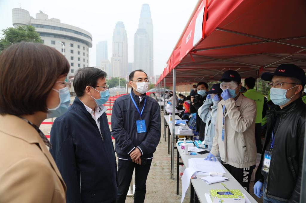 本站讯(记者赵晖 焦德芳 摄影唐蒙 陈晓金)5月6日至9日天津大学毕业年级学生陆续返校复学。7日是外地学生返校的第一天,天津大学党委书记李家俊、校长金东寒分别赴“三站一场”(东站、西站、南站、飞机场)学生接站点,实地了解外地学子抵津返校情况,并向值守在接待点的工作人员表示慰问与敬意。校党委副书记雷鸣、党办校办、学工部等有关负责同志陪同参加。
