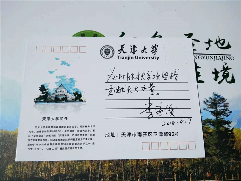 团队互动。最后,在精准扶贫公益创业展台,李家俊为天大的扶贫团队加油鼓劲,写下了“为打胜扶贫攻坚战贡献天大的力量”殷殷寄语。
