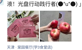 自9月3日起至10月3日,每天午餐时间,在全校各食堂开展“光盘换礼”活动。践行“光盘”的学生可以领取一张礼品兑换券,凭借兑换券到餐厅出口处领取一份新鲜水果和书签,以此鼓励学生节约粮食,拒绝“舌尖上的浪费”。