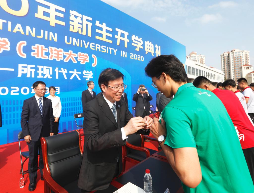 典礼在洪亮的国歌声中开幕。金东寒校长在开学典礼上讲话,为“新天大人”送去期许和祝福。教育学院院长闫广芬教授、2019级硕士研究生赵丹宁分别代表在校教师和学生发言,欢迎新生到来。化工学院化工能源与生命医药类2020级本科生谈家宁作为新生代表发言,表达求学报国之志。校领导还为新生代表佩戴上天大校徽,在场师生齐唱校歌“共扬校誉于无穷”。