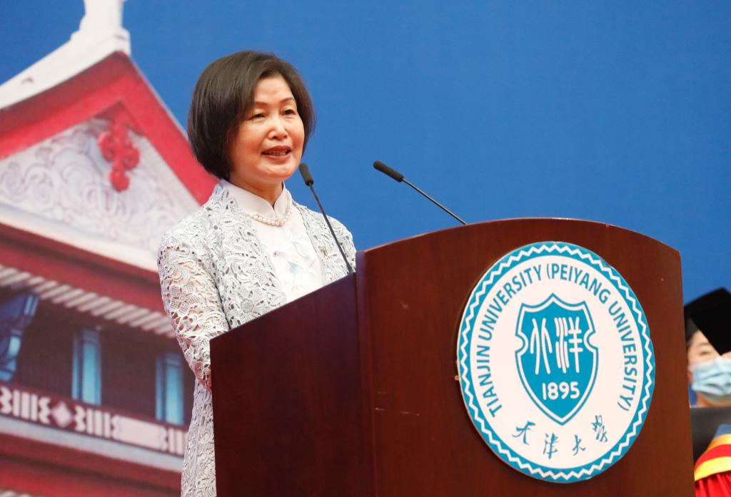 参加毕业典礼的校友代表,中国中钢集团有限公司总工程师、中钢集团洛阳耐火材料研究院名誉院长、亚太材料科学院院士李红霞是天津大学1990届硕士毕业生,她祝贺同学们冲出象牙塔,奔向新征程,开启人生新篇章。她在讲话中用自身毕业三十多年来的人生经历,告诫毕业生们要坚持学习,善于思辨,要坚持不懈,勇于创新,要胸怀家国,不忘初心。她说,人生不是游戏,没有机会重开一局,“摸鱼”或“躺平”终将走向平庸,要用心做好每一次选择,用力走好每一个脚印;只有坚持学习,善于思辨、敢于创新,胸怀家国、不忘初心,才能担负起母校与祖国的未来。