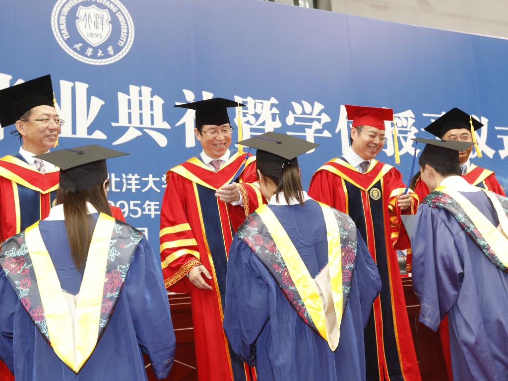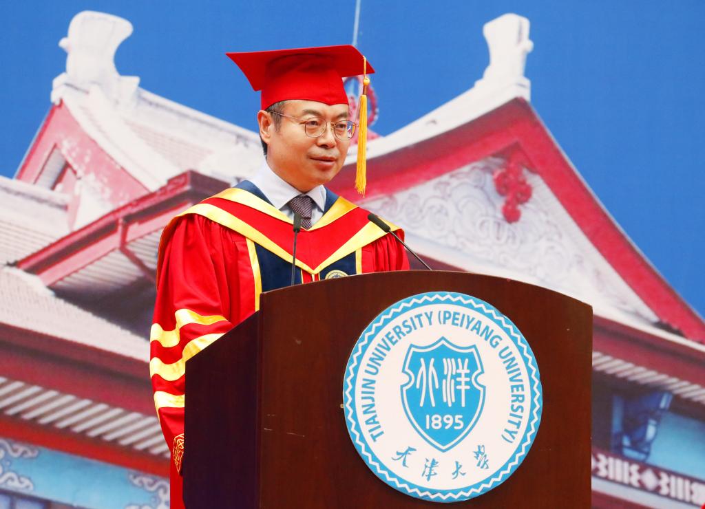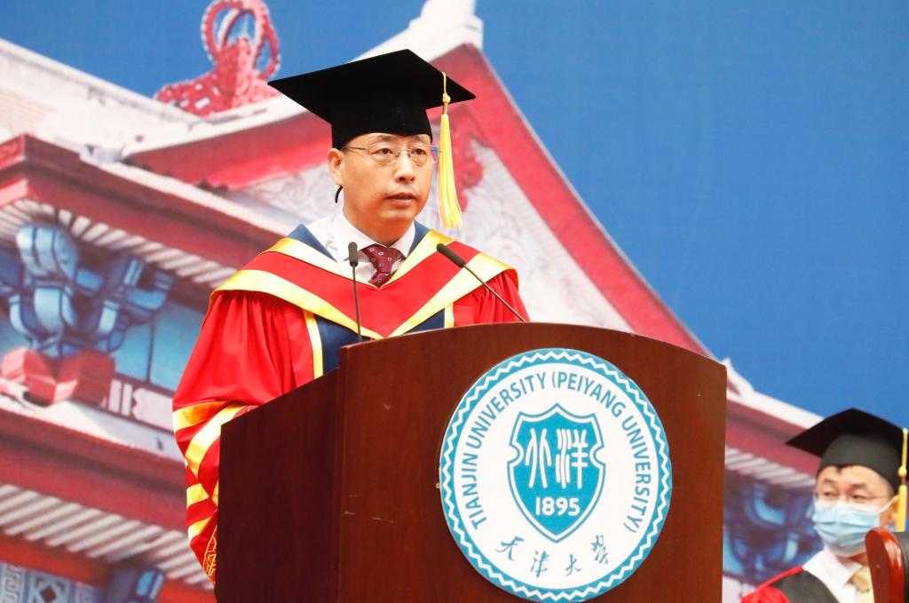 金东寒在毕业典礼上作题为《争做堪当民族复兴重任的时代先锋》的讲话,他勉励同学们要坚定理想信念,筑牢先锋之魂;要坚守创新进取,锻造先锋之能;要坚持拼搏奋斗,增强先锋之勇。他说,“中华民族伟大复兴的前进步伐势不可当,天大学子爱国报国、建功立业可谓正当其时。”他希望作为新百年奋斗征程上第一批走出天大校园的青年,肩负着民族复兴的伟大使命,应当自觉站在时代前列,以先锋姿态奋勇前行。