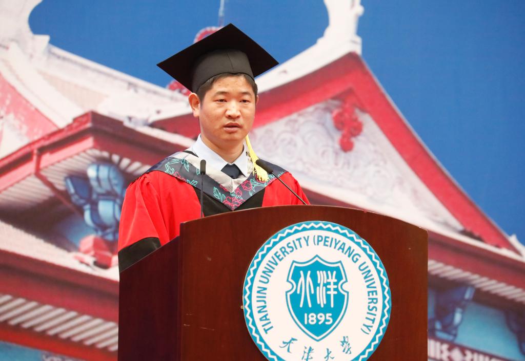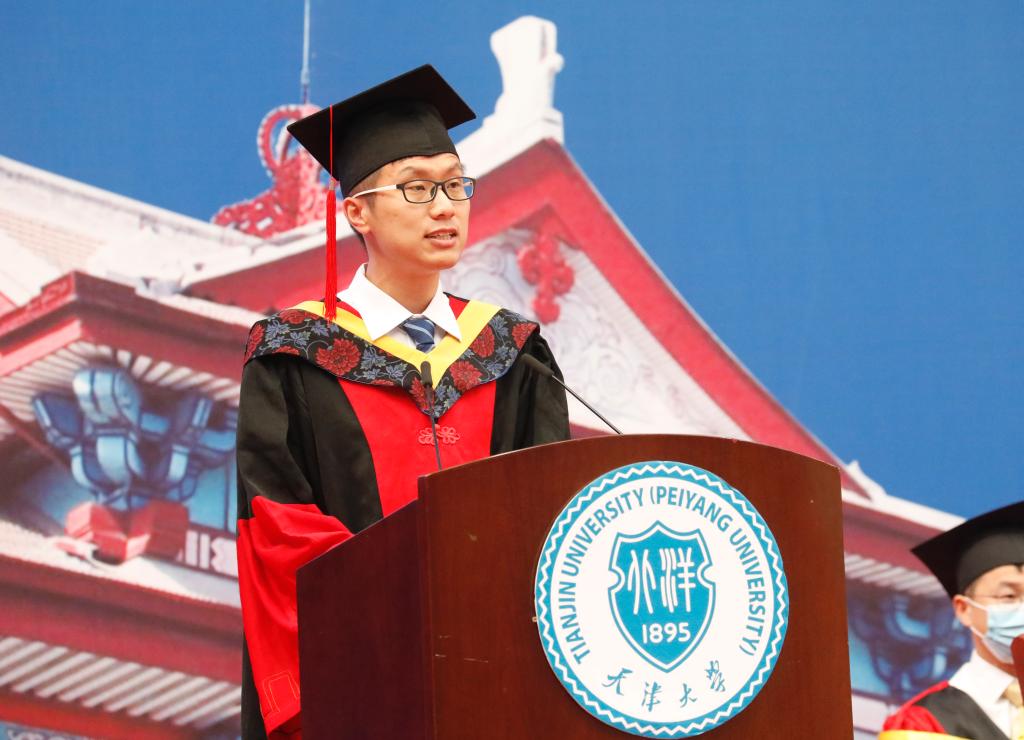 化工学院2017级博士研究生杨贺玮作为2021届研究生毕业生代表发言。今年是杨贺玮在天大的第十个年头,他见证了天大一个又一个历史性时刻,感受了母校一次又一次跨越性的前行。走出校园,他要继续用行动,坚定理想信念,践行初心使命。未来将以实现中华民族伟大复兴为己任,增强做中国人的志气、骨气、底气,不负时代,不负韶华,不负党和人民的殷切希望!请党放心,强国有我!