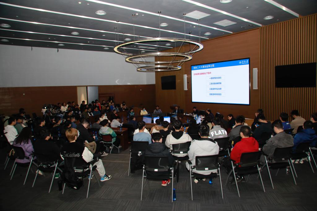 金东寒从大会主题、主要成果、实践成就、理论遵循、使命任务、战略部署、重要保障、精神品质、思想方法等九个方面的“深刻认识”与同学们深入交流,系统全面地梳理了党的二十大精神,既坚持原汁原味又坚持结合实际,既坚持系统全面又坚持突出重点。在讲到过去五年的工作和新时代十年的伟大变革时,金东寒用多组详细数据从中国高度、中国速度、中国跨度、中国精度、中国深度、中国力度、中国厚度、中国密度、中国广度、中国温度等十个维度来标识这非凡十年,加深了同学们对历史性跃升内涵的理解。“事非经过不知难,成如容易却艰辛”。金东寒指出,这10年伟大变革的根本原因就在于,党确立了习近平同志党中央的核心、全党的核心地位,确立了习近平新时代中国特色社会主义思想的指导地位,进一步帮助同学们深刻理解“两个确立”的决定性意义。聚焦同学们普遍关注的高等教育话题,金东寒强调,党的二十大报告与以往不同,专设了“实施科教兴国战略,强化现代化建设人才支撑”一章,突出强调教育、科技、人才是全面建设社会主义现代化国家的基础性、战略性支撑,金东寒认为,将教育、科技、人才一体安排,指明了三者对于国家富强、民族复兴的重要意义,高校作为教育、科技、人才的重要结合点,大有可为,大有作为,应该自觉承担起教育强国、科技强国、人才强国的责任。