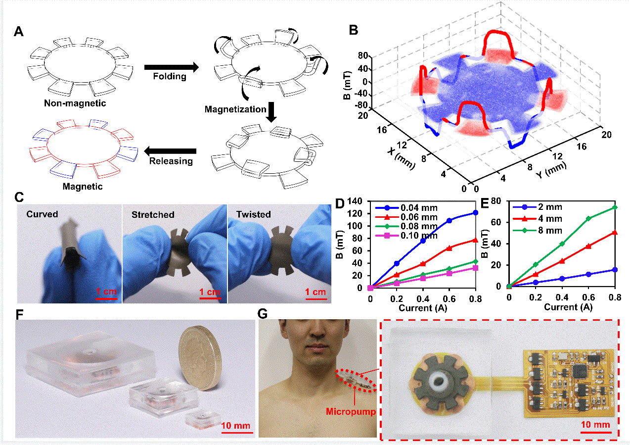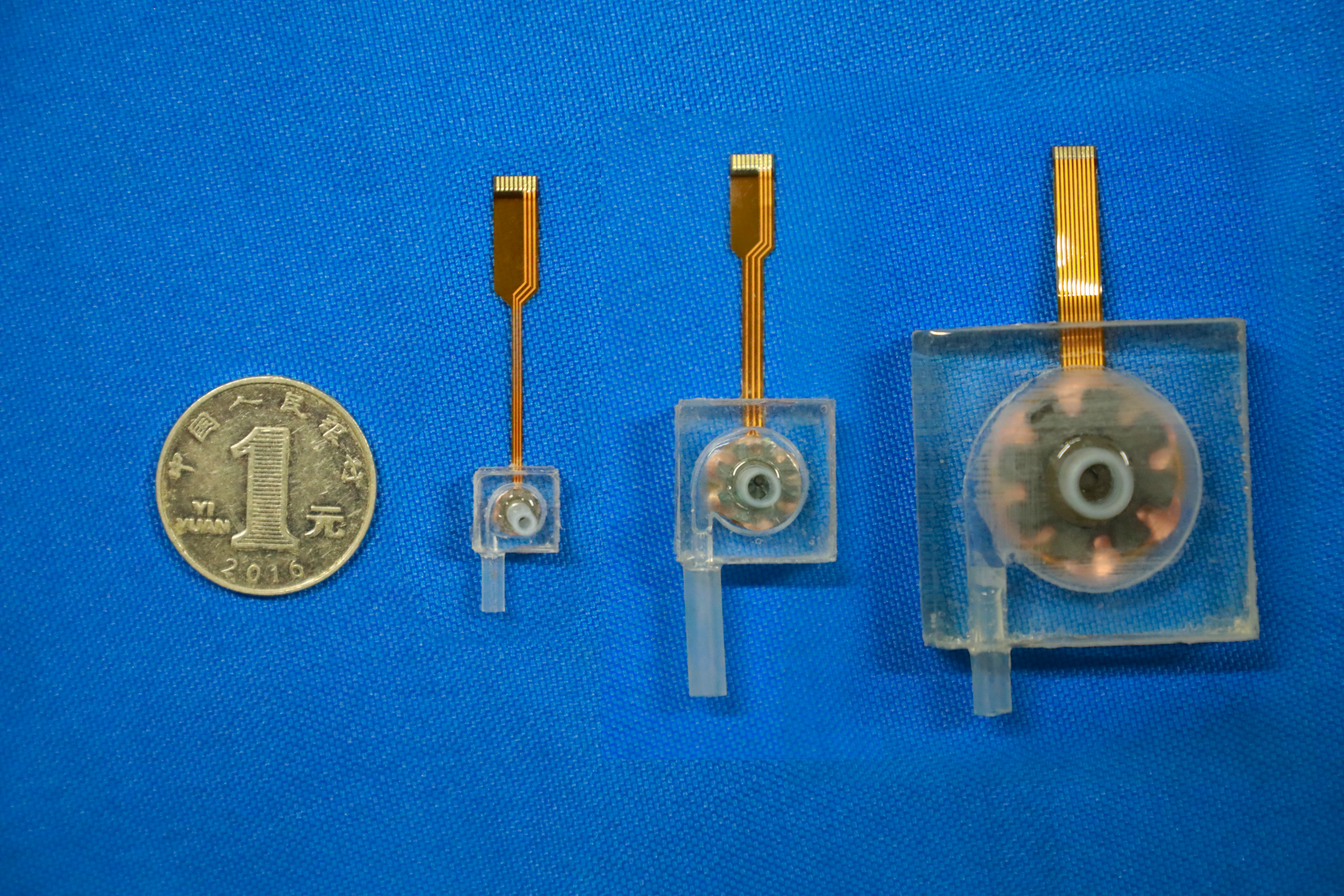 柔性磁悬浮微型离心泵主要由柔性磁性转子、蜗壳型腔室、磁束缚环和柔性控制电路四大部分组成。柔性磁悬浮微型离心泵通过独特的磁悬浮设计,通过磁束缚环将磁性转子以磁悬浮的方式稳定于蜗壳型腔室中,避免了磁性转子与蜗壳腔室摩擦接触造成的旋转阻碍和能量损耗;通过三相线圈和柔性控制电路控制磁性转子在液体环境中高速旋转,从而实现液体泵流。针对不同的应用场景,黄显团队研发了体积从0.3 ~11.7 cm3,质量从0.3-12.8g不同的离心泵系统。该泵突破了柔性磁性转动结构设计和制备技术、磁性薄膜的磁束缚技术和转动薄膜的测试表征技术。柔性泵的最大的体积和重量仅为现有刚性离心泵的1/20。