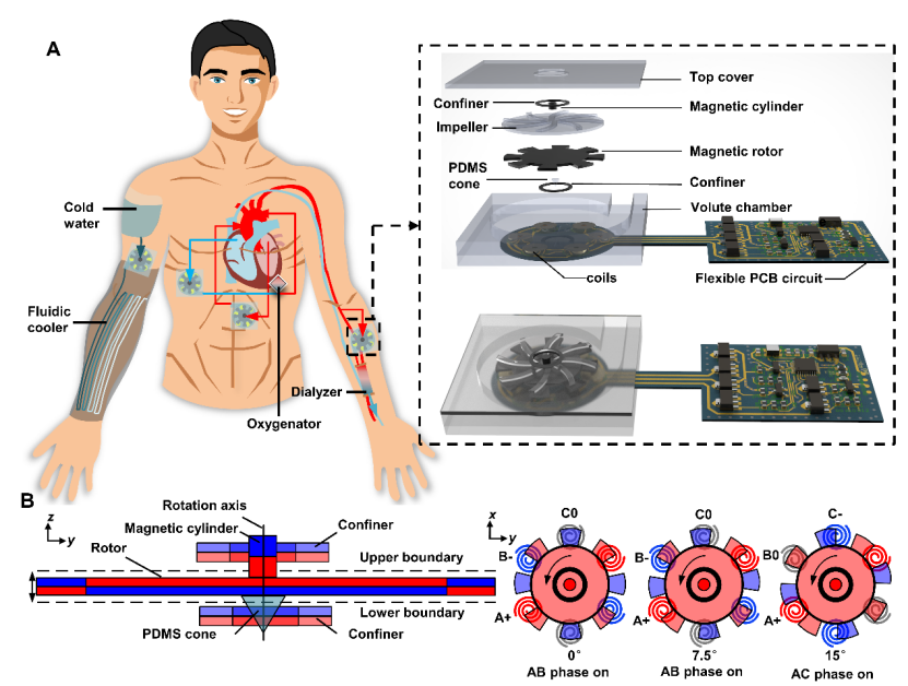 离心泵占世界泵产量的80%以上,具有高转速、大流量液体输运和低维护要求的特点,是工业、家庭、医学和科学研究中液体输送常用的机械系统之一,也是许多医疗辅助设备的重要组成部分,例如心室辅助装置 (VAD)、体外膜肺氧合 (ECMO) 机和透析机等,为数百万患有心血管疾病和慢性肾脏疾病的患者提供服务。然而,现有的离心泵大多由机械刚性部件构成,体积和质量都比较大,无法随时随地的满足使用需求,而且刚性的高速旋转的转子和固定的转轴也会对血细胞等医学流体产生损伤,影响患者健康。