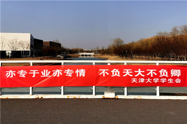 平日里一本正经的工科男“早有准备”,他们发挥学霸潜质,在校园各处挂上了一条条精心准备的暖心横幅。这些横幅的内容都充分结合了具有“天大特色”的学科背景和专业知识,语言诙谐,情真意切,充盈着真挚美好的同窗祝福,让人看过之后不觉会心一笑。