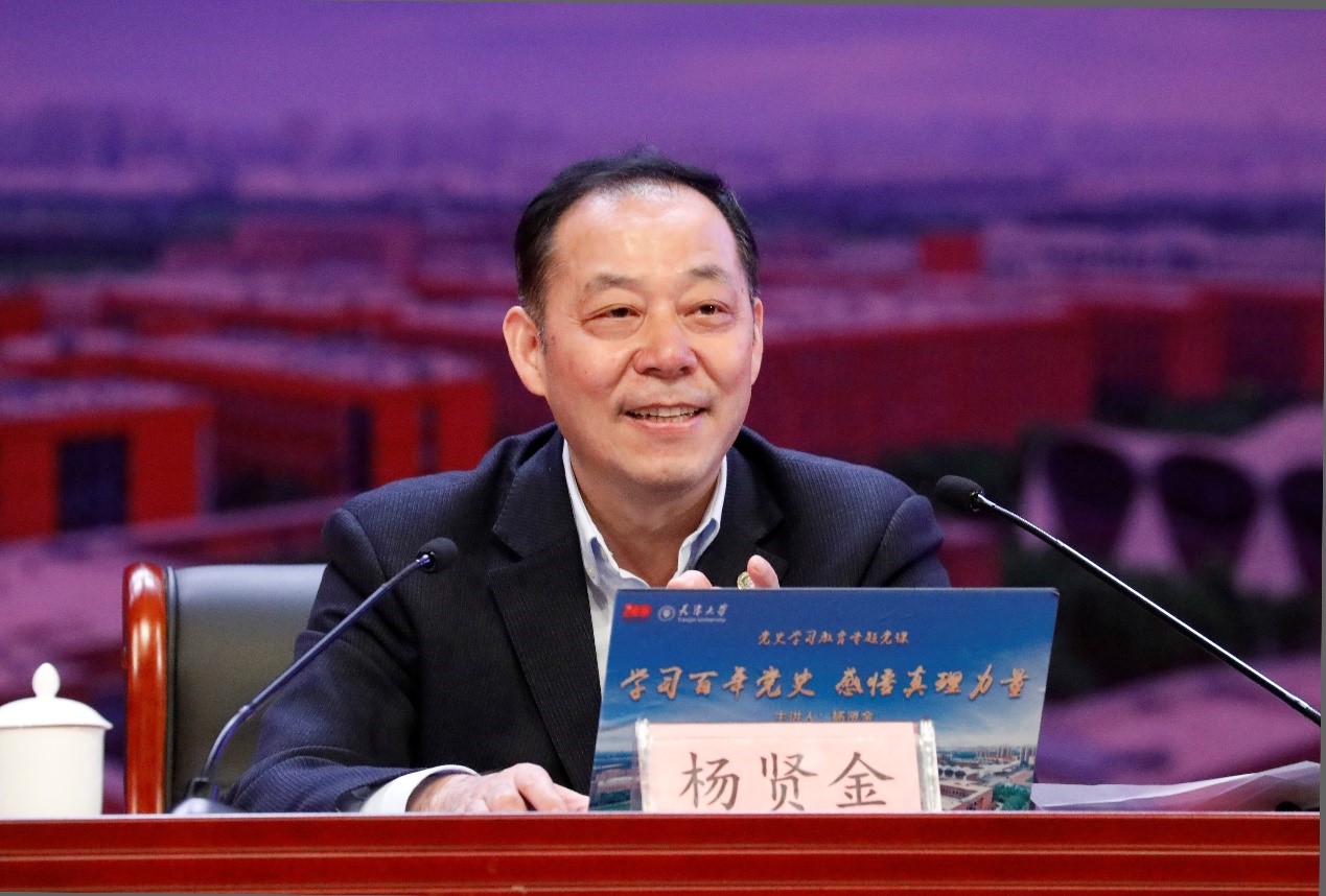 “1980年我从江苏考到天大,那时最快的火车是绿皮特快,从南京到天津要走17个小时,现在从天津到南京做高铁只需要四五个小时。”从自己的经历说起,杨贤金用载人航天、超级计算机、高铁、5G通讯等学生们身边的“成就”,对站起来、富起来到强起来三次伟大飞跃做了生动的讲解,引导同学们从百年党史中深刻理解中国共产党为什么“能”、中国特色社会主义为什么“好”、马克思主义为什么“行”。“历史是最好的教科书,回望历史才能远观未来,走得更远。”杨贤金要求同学们要坚定信仰,感悟真理,在新征程中牢记初心使命,接力开创美好未来。