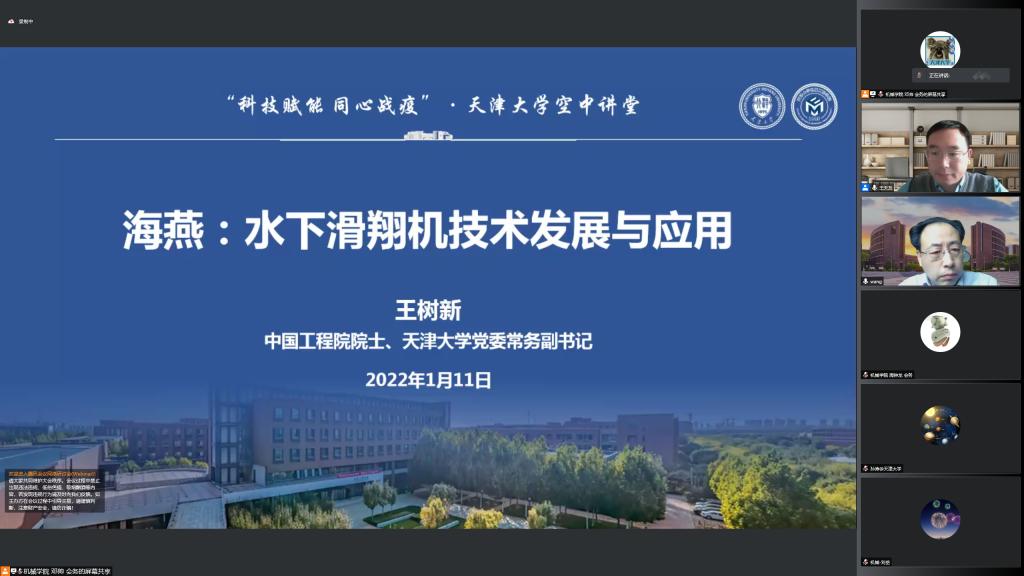 本站讯(记者刘晓艳)1月11日下午15:00,天津大学“科技赋能 同心战疫”空中课堂第二讲迎来了家喻户晓的“大明星”——“海燕”水下滑翔机。中国工程院院士、天津大学党委常务副书记王树新以“海燕:水下滑翔机技术发展与应用”为题,向校内外约千名师生详细介绍了“海燕”的“研究背景与重要意义”“发展方向和主要进展”以及“趋势预测、亟需技术”等。空中课堂第二讲由机械学院院长王天友教授主持。