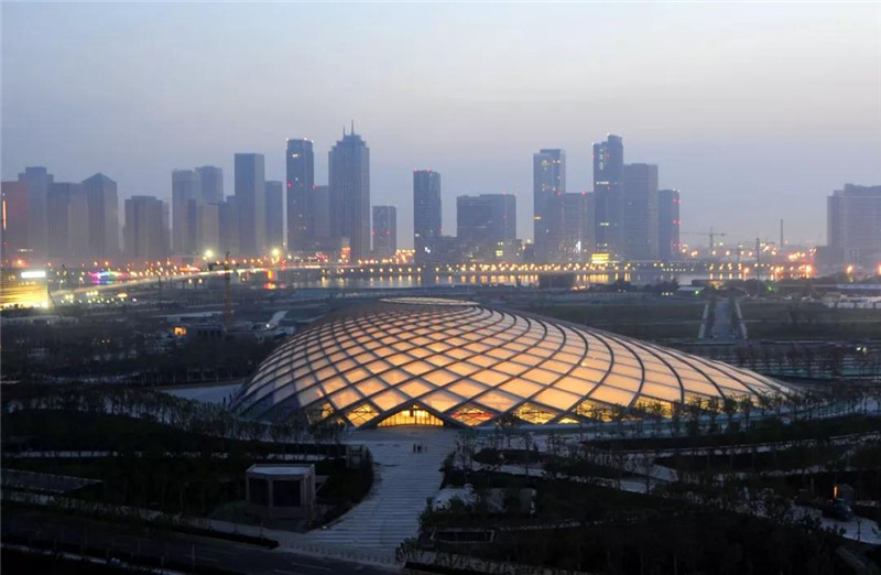 于家堡网壳结构体系的创新主要包括复杂优美的网格形式和罕见的大跨度。网壳由36根顺时针方向和36根逆时针方向的螺旋形箱梁杆件相互编织,在顶部交织成36个点与顶部钢环梁连接。在底部也交织成36个钢节点与底部钢环梁连接,这样一个顶环梁+编织网+底环梁的单层编织网通过支座与地下结构顶板连接;形成纵向跨度143米、横向跨度80米、矢高24米的贝壳形单层网壳结构。
