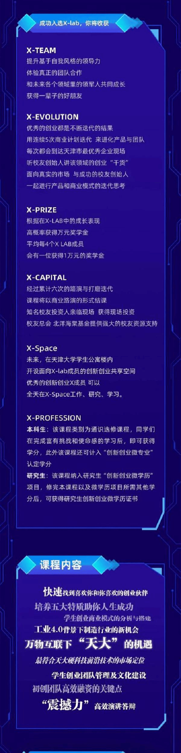 X-lab由天津大学宣怀学院和北洋海棠基金共同发起,天津大学在校本科生、硕士生(含MBA/EMBA/MEM等)和博士生(含工程博士)均可以报名加入。在学习过程中,还有机会入驻由学工部和校团委共同建设的X-space,其中创新创业微学历由研究生院和宣怀学院共同建设,创新创业微专业由教务处和宣怀学院共同建设。