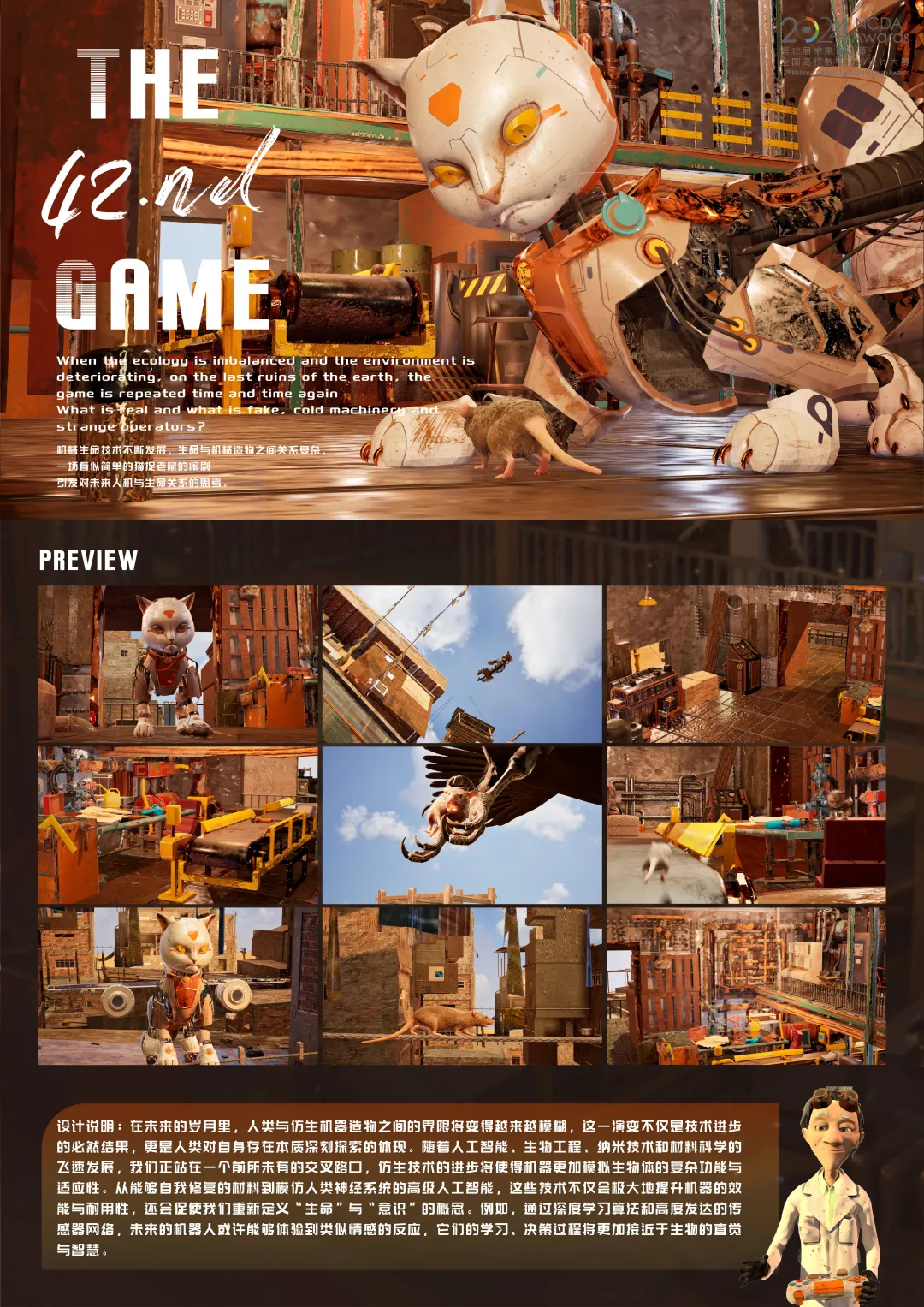 一等奖作品《The 42nd. Game》。该作品的作者为辛天瑀、吴梦晗、杨潇涵 ,指导教师为于浩。在未来的岁月里,人类与仿生机器造物之间的界限将变得越来越模糊,这一演变不仅是技术进步的必然结果,更是人类对自身存在本质深刻探索的体现,随着人工智能,生物工程,纳米技术和材料科学的飞速发展,我们正站在一个前所未有的交叉路口,仿生技术的进步将使得机器更加模拟生物体的复杂功能与适应性,从能够自我修复的材料到模仿人类神经系统的高级人工智能,这些技术不仅会极大地提升机器的效能与耐用性,还会促使我们重新定义"生命"与"意识"的概念。例如,通过深度学习算法和高度发达的传感器网络,未来的机器人或许能够体验到类似情感的反应,它们的学习,决策过程将更加接近于生物的直觉与智慧。机械生命技术不断发展,生命与机械造物之间关系复杂。本三维动画作品,以一场看似简单的猫鼠追逐闹剧,引发对未来人机与生命关系的思考。
