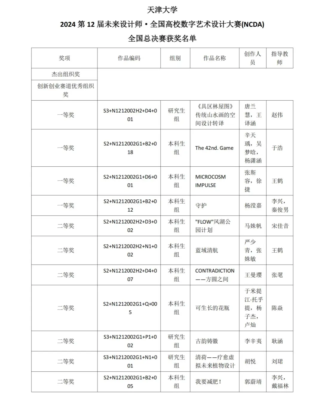 本站讯 近日,第十二届“全国高校数字艺术设计大赛(未来设计师NCDA大赛)” 全国总决赛评审工作落下帷幕。本届大赛全国共有1891所高校参赛,共征集298763件作品,设立29个省级赛区;985、一流大学参赛率达95.2%,设计学学科评估C-以上高校100%参赛。参赛作品经校赛、资格赛、省级初赛、省级决赛、全国总决赛,评选出国赛一二三等及优秀奖(创新创业赛道除外)。天大学子成绩斐然,在国赛中共荣获一等奖4项、二等奖7项、三等奖5项,共计16项的优异成绩。同时,秦俊男、王鹤、张毣、赵伟4位老师获评优秀组织教师,秦俊男、王鹤老师还获评创新创业赛道优秀组织教师。作为组织单位,天津大学荣获杰出组织奖和创新创业赛道优秀组织奖。