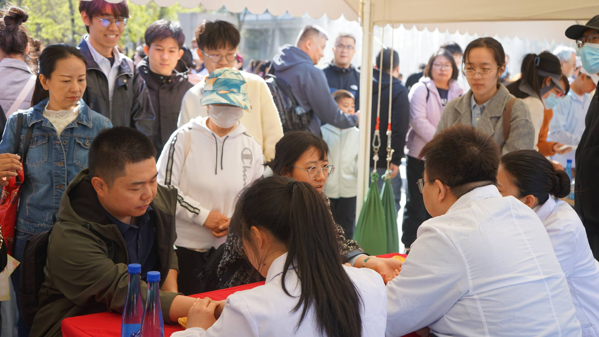 现场设置的两个体格检查服务站更是排起长队,医学院临床医学专业的学生志愿者们认真为市民朋友测量身高、体重、视力,检测血糖、血压、血脂。在检查过程中,志愿者们还贴心地为对大家普及健康管理知识,从日常饮食搭配到运动锻炼建议,再到定期体检的重要性,帮助大家提升健康意识与自我管理能力。此外,志愿者们积极热情地向市民游客发放“津生相‘髓’”等精心编制的造血干细胞捐献宣传册资料,为市民详细介绍造血干细胞血样采集知识。