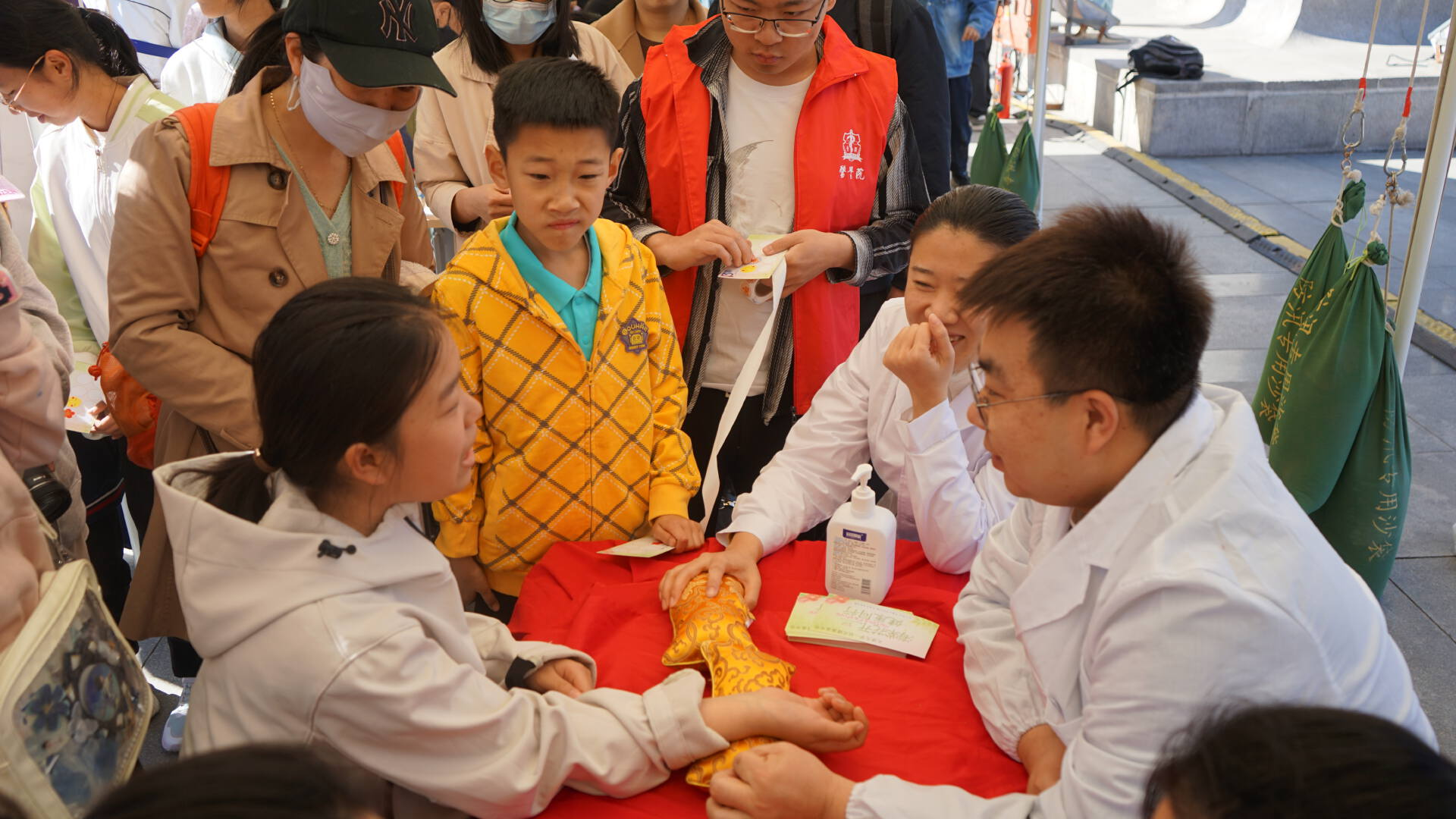 北洋广场上,健康嘉年华活动现场热闹非凡,八大特色摊位有序排列。在“中医四诊及养生保健”摊位前,医学院特意邀请到天津中医药大学的志愿者一道为游客们细致把脉、看舌象,耐心讲解养生知识;海姆立克及心肺复苏演示区,天津市红十字会的志愿者与医学院临床医学专业的学生,一边详细讲解急救要点,一边进行规范的操作演示,吸引众多游客围观学习,大家纷纷上前模拟练习,只为在关键时刻能派上用场,守护生命安全。