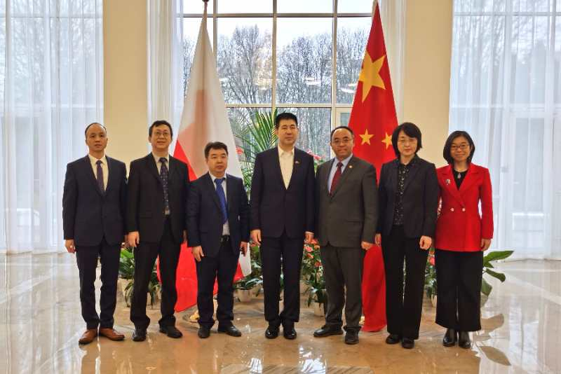 12月18日上午,胡文平一行还拜访了中国驻波兰大使馆。我国驻波兰大使孙霖江和教育参赞易军接见了我校代表团,并就进一步推动天津大学与波兰高校、中东欧高校的合作进行了沟通交流。胡文平简要介绍了此次访问情况和学校对中东欧国家合作概况,并表示未来学校希望进一步依托使馆平台,大力加强人文交流及学术交往,深度嵌入中外人文交流和外交战略整体布局。孙霖江大使表示波兰是最早与新中国建交的国家之一,中波友谊与合作的基础牢固。波兰2015年加入“一带一路”朋友圈,是“一带一路”沿线重要国家,中波合作、中国-中东欧国家合作与中欧合作三者的关系相互依托、相互促进。双方依托天津大学优势学科和平台,推动双方在教育、新利18网址登录