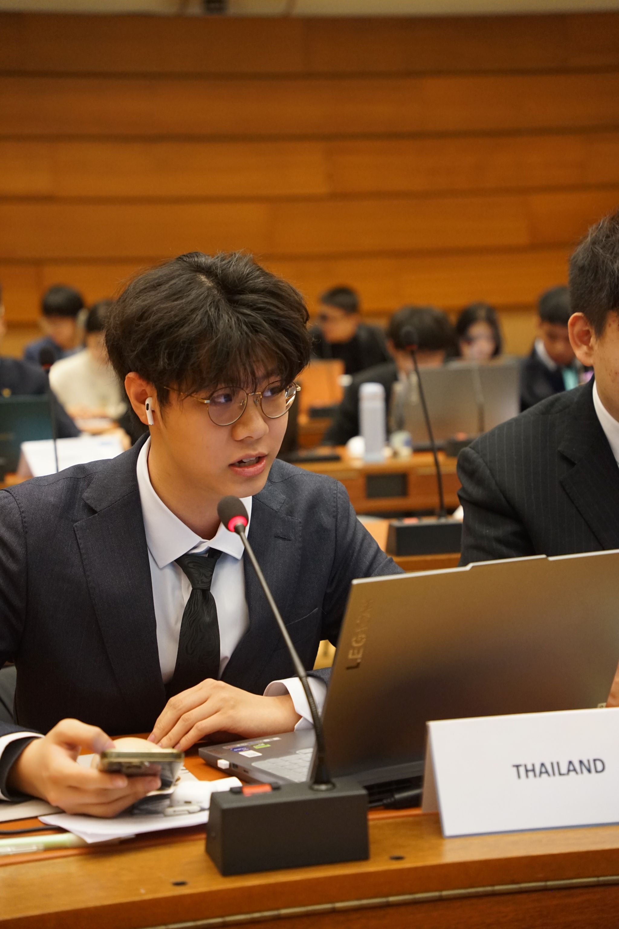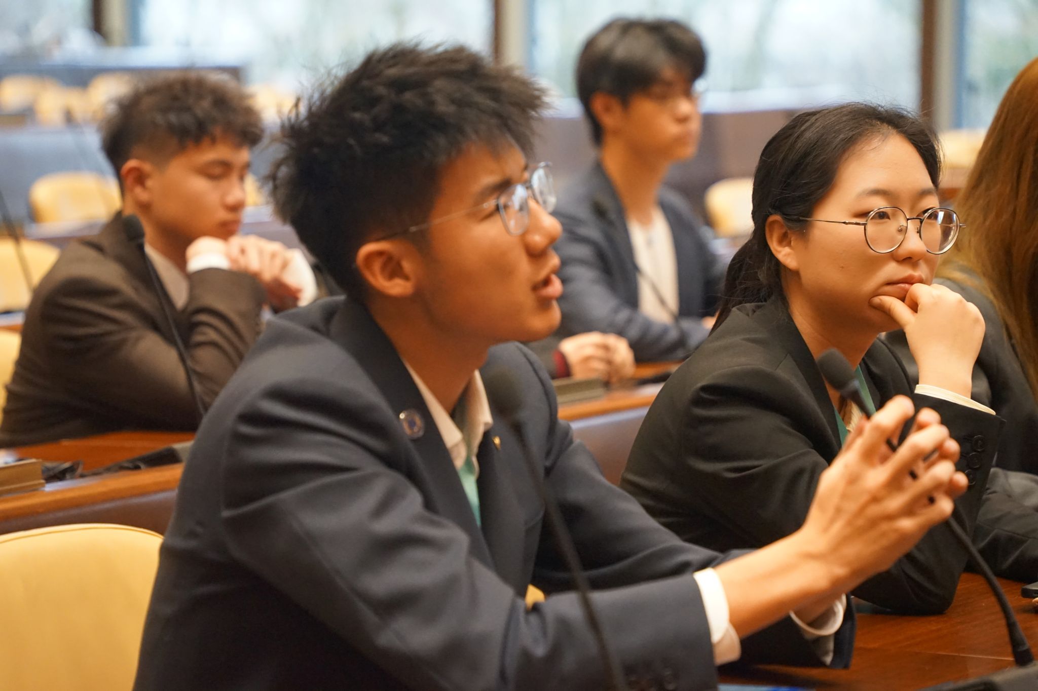 在模拟联合国大会上,天津大学的学生化身各国代表,围绕生物多样性与环境保护、绿色循环经济、能源技术转型、人工智能教育等全球性议题展开激烈讨论。