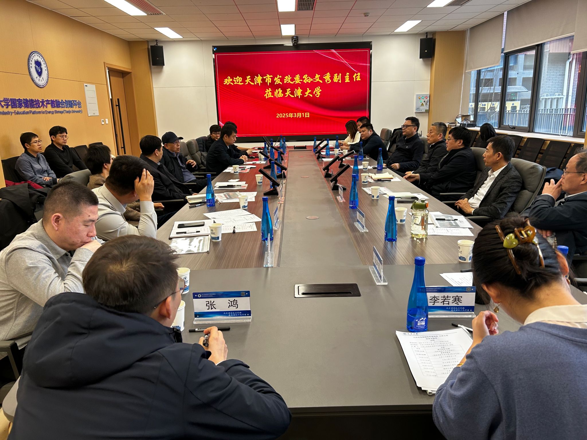 本站讯(通讯员 车宇昂 唐璿)2025年3月1日,天津市发展和改革委员会党组成员、副主任孙文秀一行到访天津大学国家储能技术产教融合创新平台(简称“国家储能平台”),共同探讨储能行业发展。陪同到访的有天津市发展和改革委能源处处长刘奎建,国网天津市电力公司蓟州供电分公司副总经理苏有功、欧干新,天津市工商联副主席、政协委员、天津市大疆储能技术有限公司董事长于海林等领导与专家。中国工程院院士、天津大学国家储能平台主任王成山接待来访,未来技术学院党委书记凌国维,国家储能平台常务副主任焦魁,国家储能平台副主任朱丽及相关教师陪同会见。会议由焦魁主持。