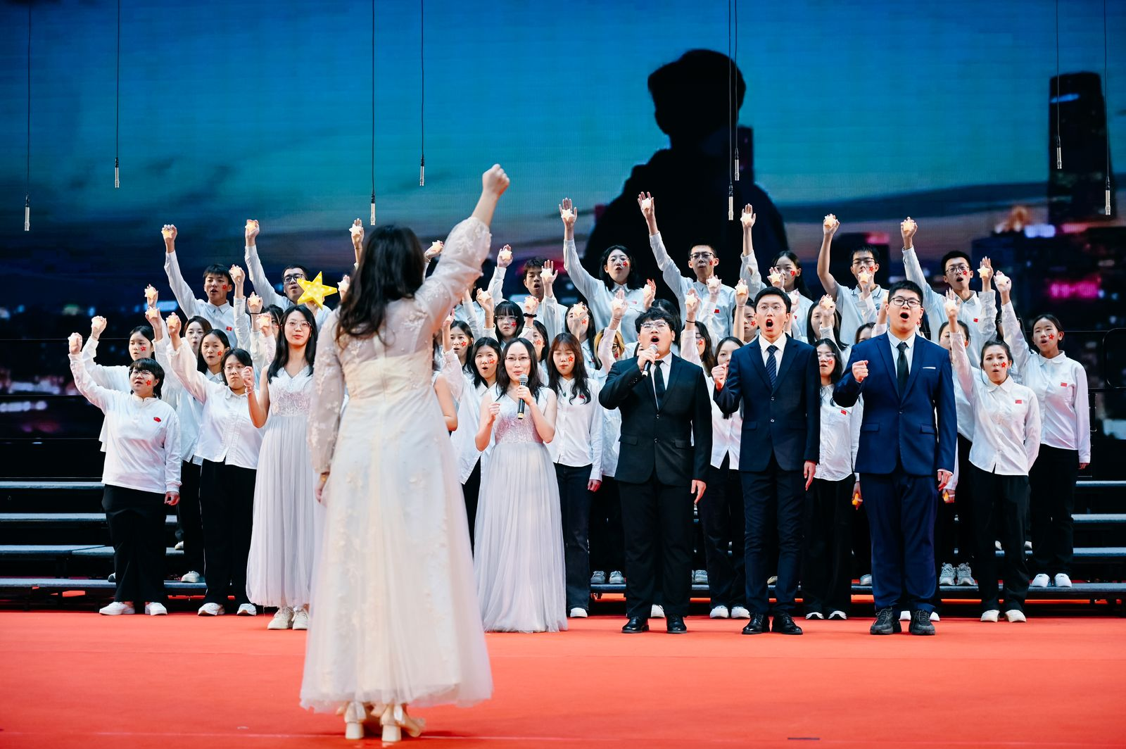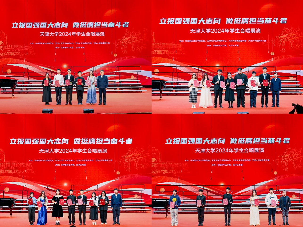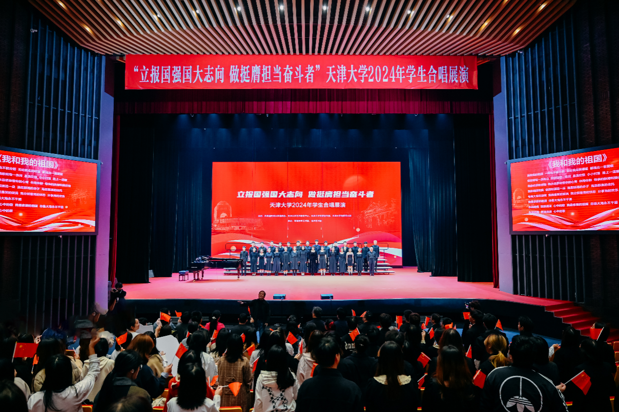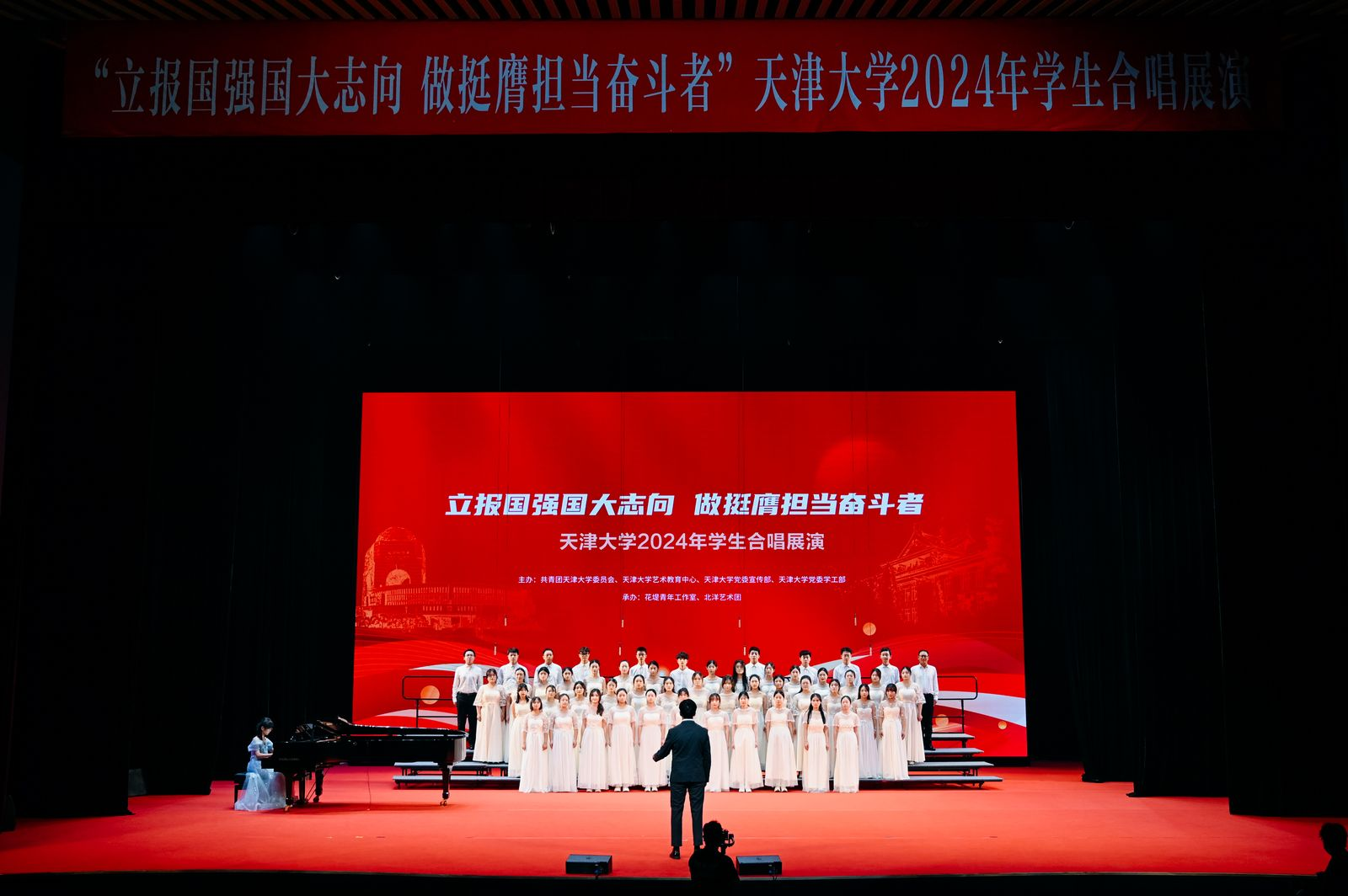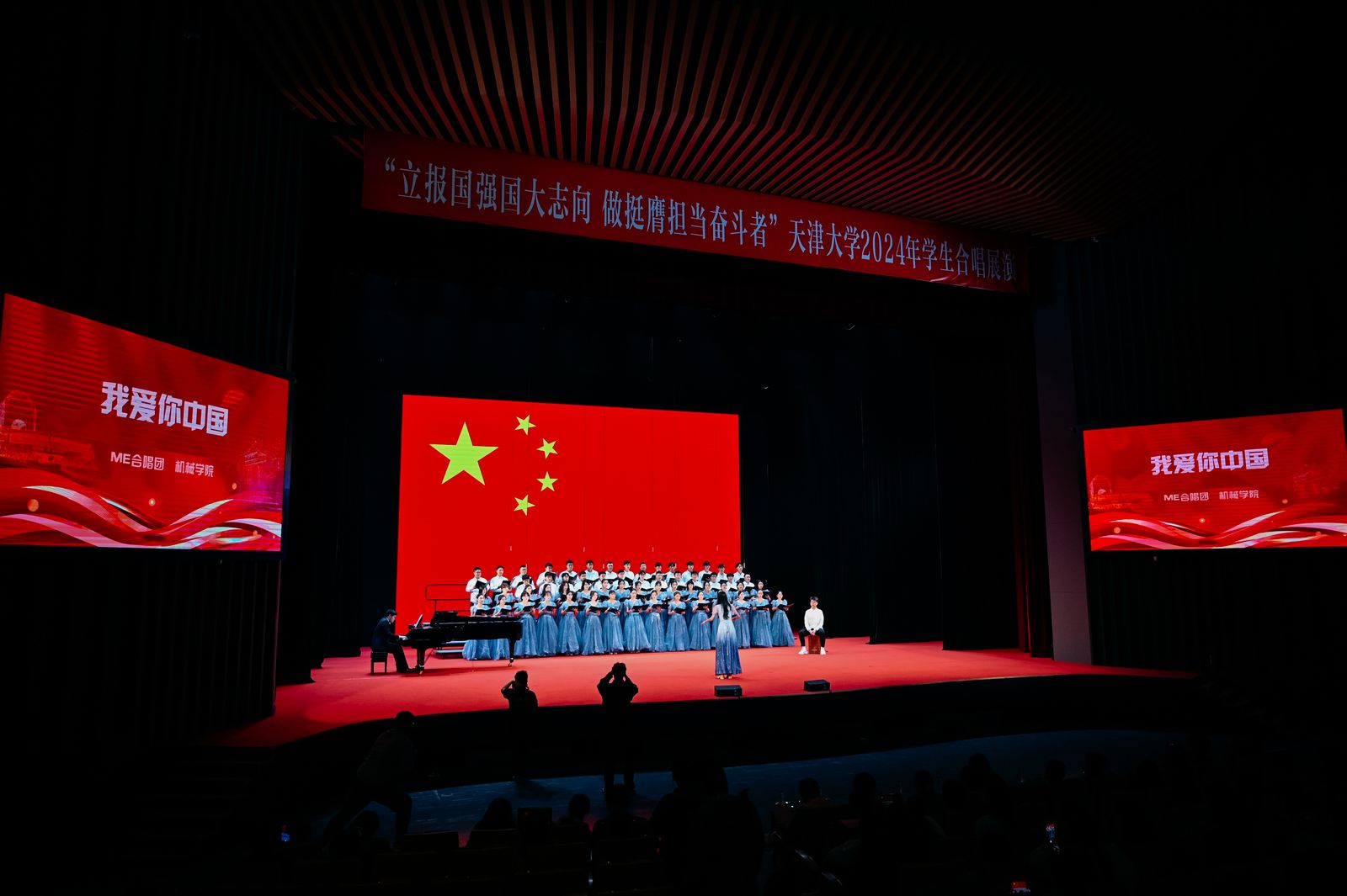 演出在雄壮的国歌声中拉开帷幕。来自全校27个学院(部)的19支合唱团为现场观众带来了精彩的演出,《我爱你中国》《歌唱祖国》《天耀中华》《国家》等合唱曲目在求实会堂唱响,用饱含深情的音符和充满力量的旋律述说天大青年的拳拳爱国情,殷殷报国志。同学们深情演绎的《有我》《如愿》《我们都是追梦人》等曲目,将青年的激情、朝气和梦想娓娓道来,彰显天大青年把青春理想、青春奋斗融入到中华民族伟大复兴壮阔征程的志向。由“医心合唱团”带来的原创歌曲《兴医》,唱出了医学领域学生肩负兴医重任,力求科技报国的责任感与使命感。微颂合唱团演唱了原唱歌曲《漫途》,歌曲旋律悠扬,意蕴深远,书写着青春洋溢的天大人奋进新征程的强烈愿望。