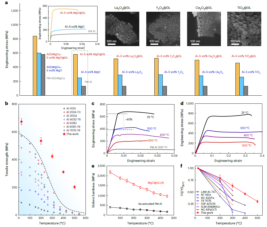 目前,提高铝合金耐热性能的途径主要有两个:一是提升析出相的热稳定性;另一条出路是引入高稳定性的陶瓷相纳米颗粒。相比于前者,陶瓷颗粒通常具有较高的熔点(>1000℃)与弹性模量,因而具有更高的热稳定性和变形稳定性。其中,氧化物陶瓷颗粒由于具有优良的强度、热传导、耐高温、耐氧化、耐腐蚀、低成本等特性,备受研究者青睐,如研究者在众多金属体系(如铁、铜、镍、钼等)中通过原位合成氧化物纳米颗粒的思路实现了优异的高温力学性能。然而,以上实现弥散分布的原理是基于氧化物颗粒在基体内溶解—析出或是液相混合后将金属前驱体还原成金属基体,对于与氧反应活性高、不可化学还原的轻金属材料如铝、镁、钛等,上述方法则无法适用。迄今为止,如何在铝合金中实现纳米氧化物弥散强化进而改善其高温力学性能,仍是铝合金甚至轻合金体系的国际性科学与技术难题。
