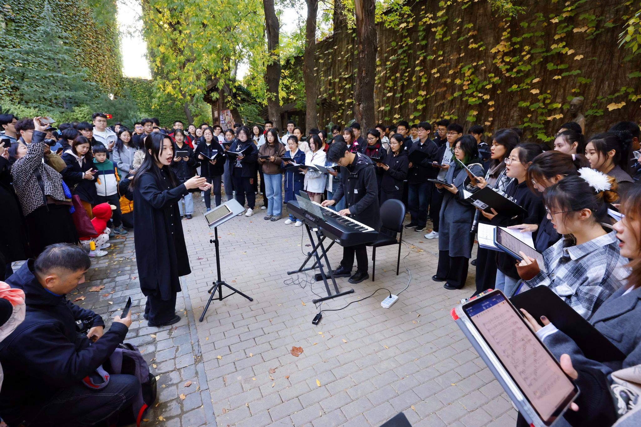 忽然,诗人徐志摩的铜像前传来歌声,原来是同学们自发组织了一场诗歌音乐沙龙。冯研院的学生们,与北洋吉他协会、天津大学主持人联盟、北洋诗词社等社团朋友们,用诗歌、音乐、舞蹈,尽情“唱秋”,抒发对美好校园生活的赞颂。来自印度尼西亚的留学生们带来家乡的歌舞,还有格鲁吉亚留学生打起中国长拳。而北洋合唱团悠扬唯美的歌声,与满墙红叶在秋风中的鸣响相应和,使人们陶醉在这美妙的时光里。