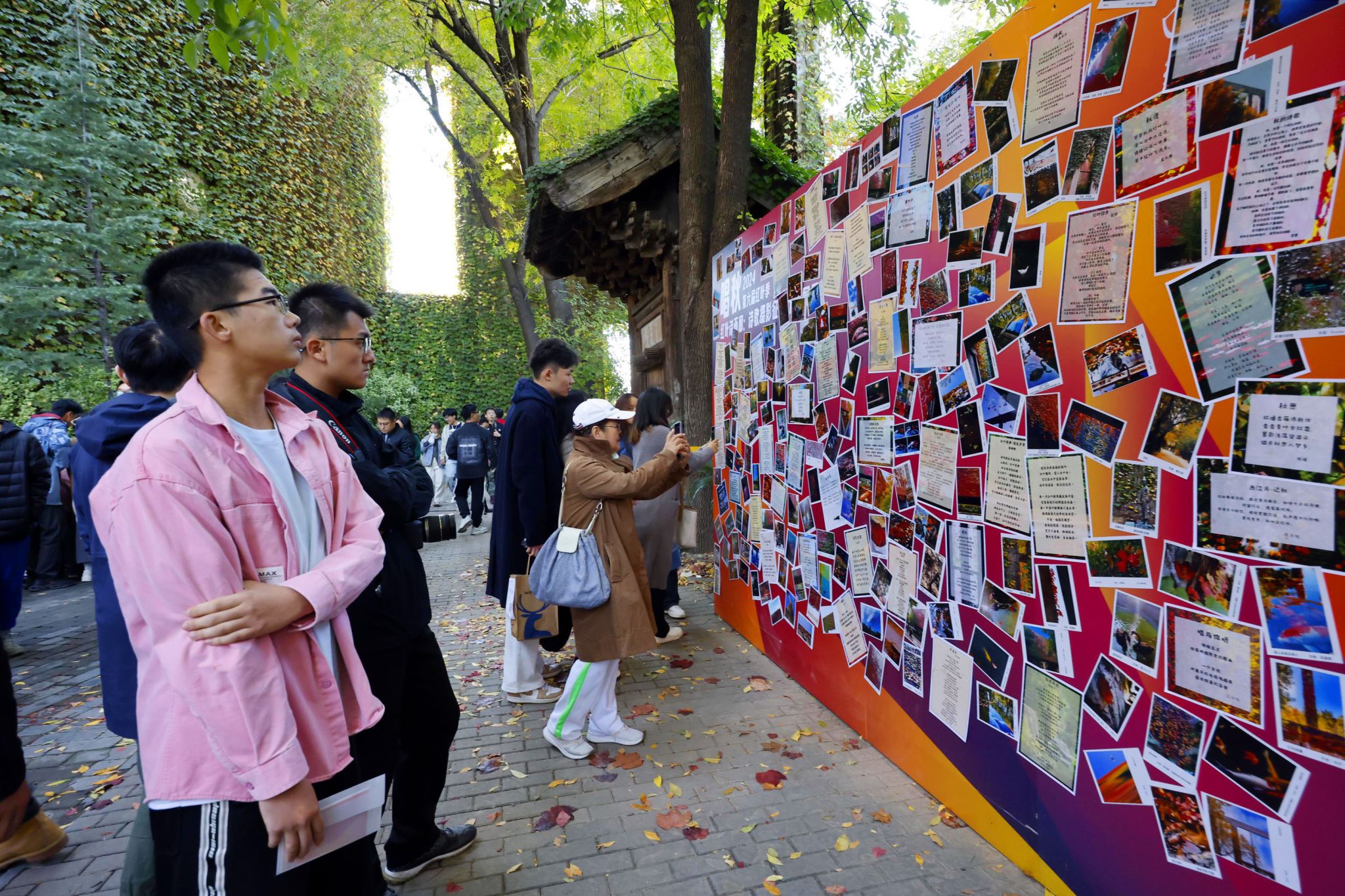 澄心池的另一侧,大家或者在红叶手作区拓印叶脉画,加盖纪念章,以多彩的创意为自己留下一份秋的纪念;或者在红叶读书角阅读往届红叶季的纪念画册,并写下心声。还有一面红叶诗画廊展壁,贴满了今年红叶季征集的诗歌、摄影作品,富有才情的佳作引来人们驻足欣赏。