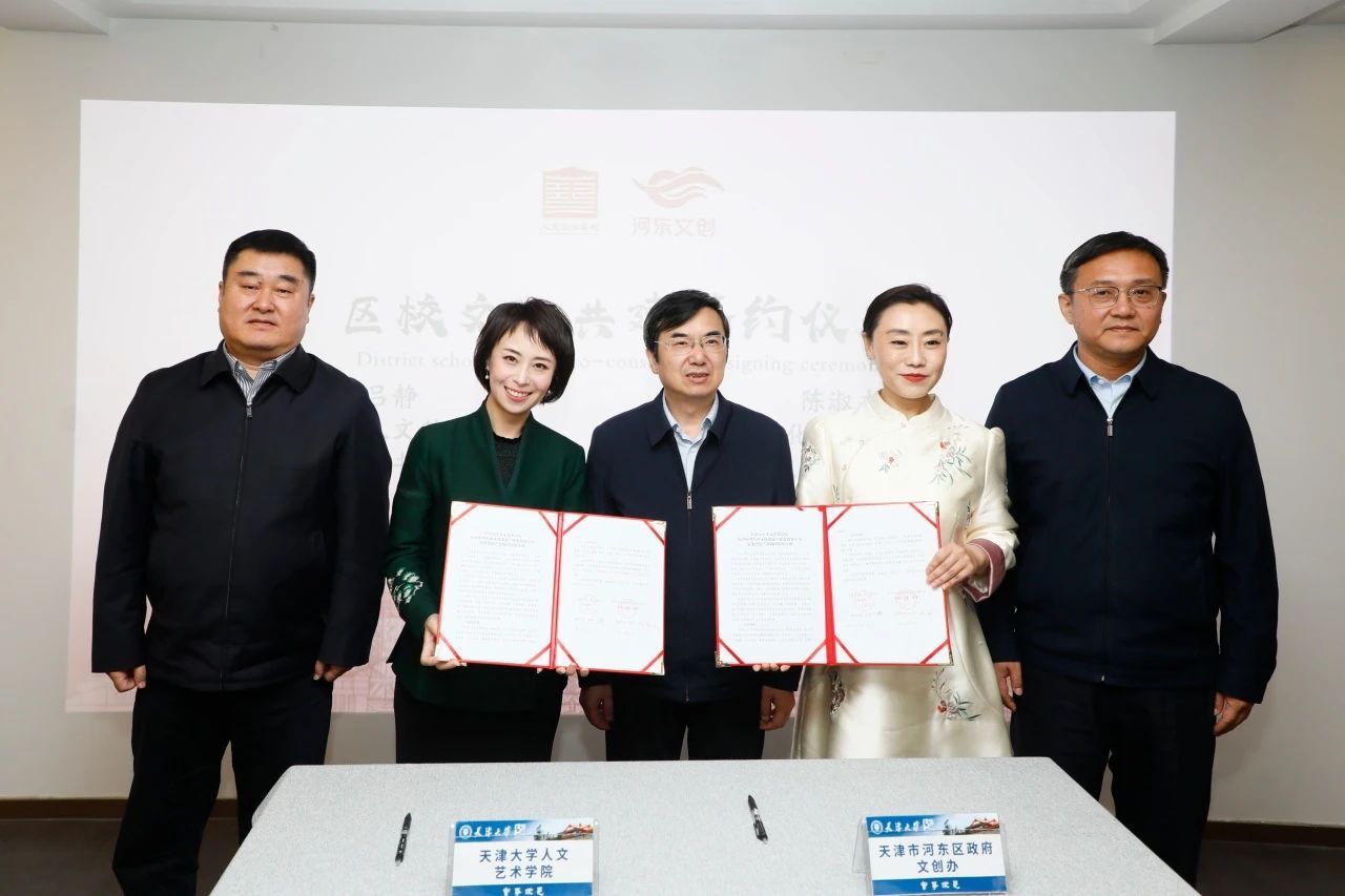 天津大学人文艺术学院与河东区文创办签署了战略合作协议,推动区校文化共建工作迈向新台阶。老津卫(天津)茶业有限公司、天津市天大赛奇节能技术有限公司、天津直沽印象文化传媒有限公司签署合作意向书,共同推动河海津韵文化体验馆项目,拓展津派文化展示空间,助力非遗老字号传承发展。