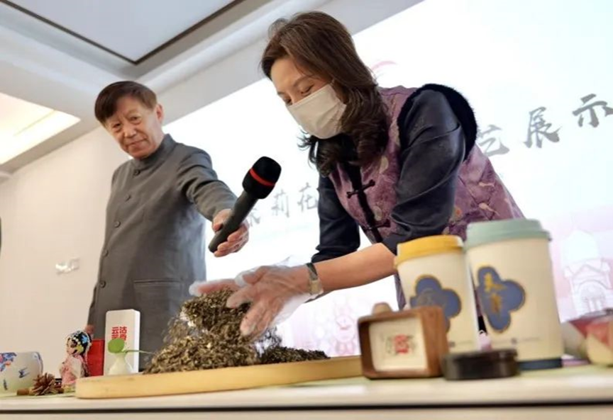 活动现场,市级非遗“老津卫”茉莉花茶拼配工艺传承人现场演示了茶叶窨香、拼配技艺,生动诠释“茶中有香、香中有茶”的独特韵味。天津大学大学生创新创业项目团队进行了“时叙棠茉”文创茶项目路演。“当非遗茉莉花茶遇到天大海棠花”,产品LOGO设计以双花共绽、北洋建筑剪影及茶汤涟漪为基础元素,象征校地文化的深度交融。