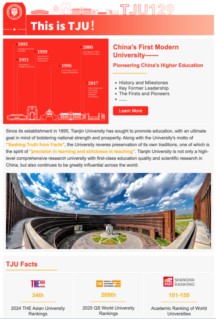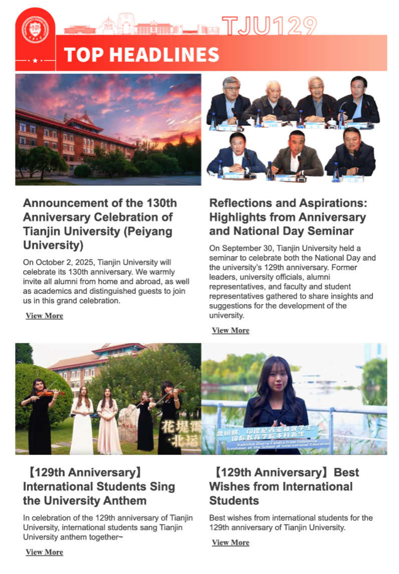 该英文电子报由宣传部制作,旨在定期向全球读者展现天津大学的发展故事,增进国际社会对天津大学的了解,加强与海内外校友和国际伙伴的联系,是天津大学加强国际交流的重要举措。