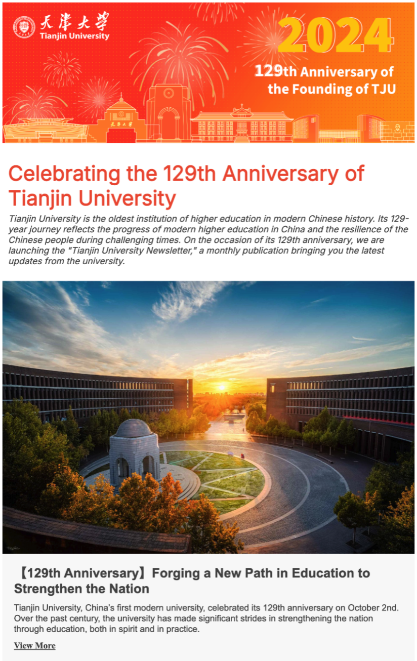 首期电子报特别推出建校129周年特刊,全面回顾天津大学从1895年北洋大学时期发展至今的辉煌历程,展现学校作为中国第一所现代大学,在奋进世界一流研究型大学的征途中取得的非凡成就。本期特刊主要内容包括天津大学129年发展历程回顾、杰出校友成就报道及校庆祝福、校庆活动特别报道等内容。首期电子报可通过复制链接并在浏览器中打开查看,https://9yj3t73o4y.preview-beefreecontent.com/Ak67。