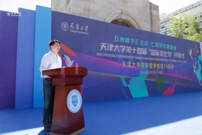 天津大学党委常委副校长巩金龙在致辞中寄语中外各国优秀青年,在此次文化节中交流互鉴、相知相亲,促进中外同学之间的友好交流,营造更好的校园国际文化氛围,共同谱写天津大学来华留学70年华丽篇章。