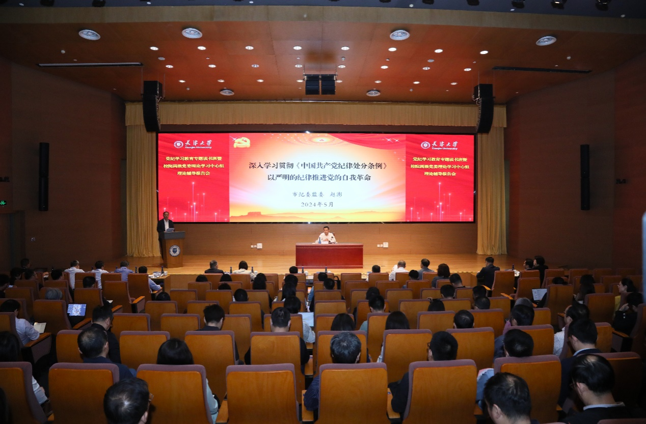 读书班期间,邀请天津市监察委员会委员赵澎作专题辅导报告,校院两级党委理论学习中心组成员200余人参加。赵澎深入领学了《中国共产党纪律处分条例》的修订情况、主要特点、主要内容以及贯彻执行条例的有关思考,并结合大量执纪案例详细解读了六项纪律的重点内容。报告内涵丰富、案例翔实、深入浅出,对于准确把握《条例》的主旨要义和实践要求有着重要的现实指导作用。
