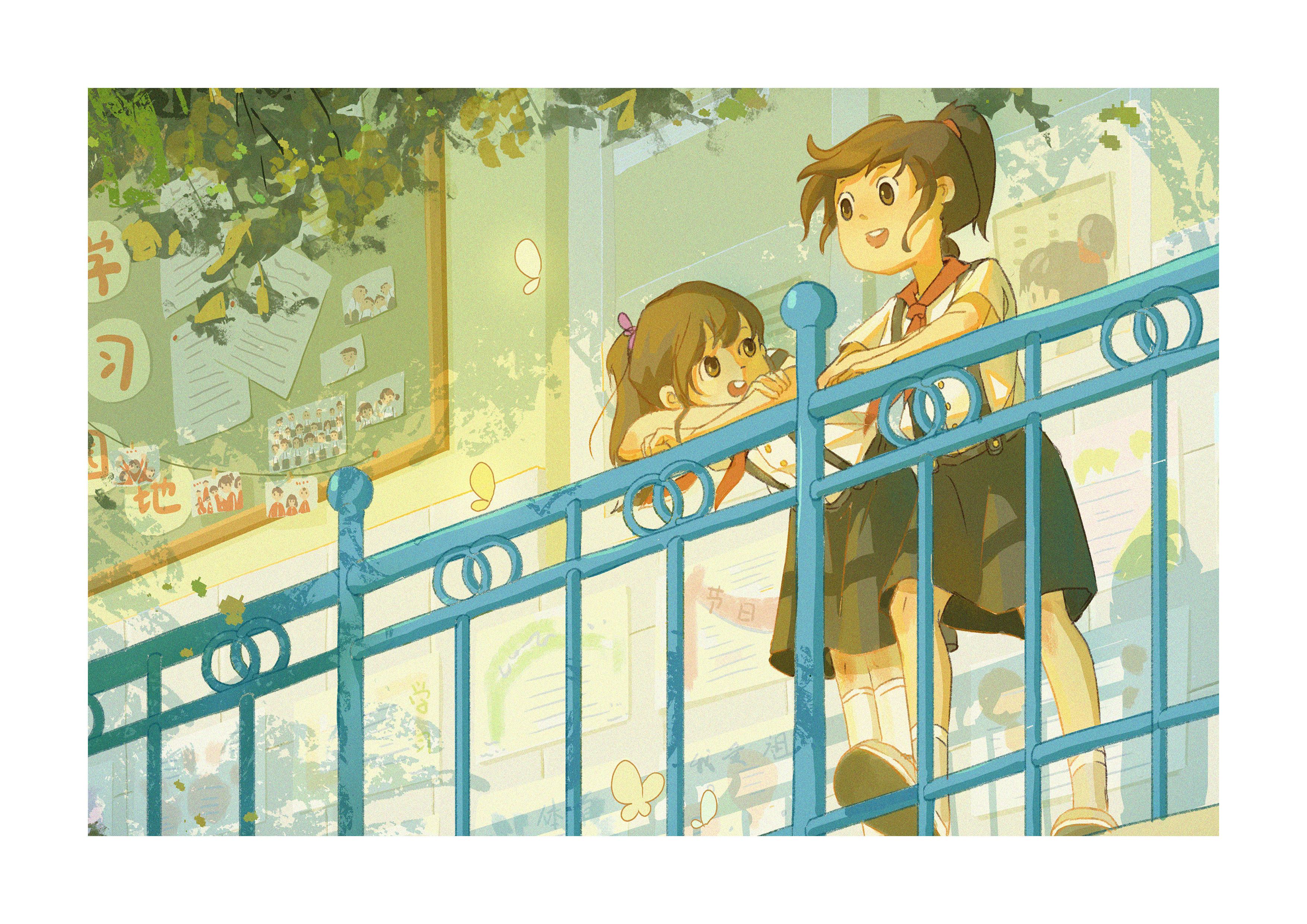 本组插画展现了:天灾人祸摧残后的末世下,两个小孩子穿梭于废弃的钢筋丛林之中,进行着他们称之为“句芒引春计划”的绿芽拯救行动,凭借自己的微薄之力将绿色带回荒芜的大地。孩子们的天真烂漫与顽强的生命力,在盎然的绿色中与残存的工业废墟形成鲜明对比。这幅画面传达了对和平生活的无限渴望,以及对自然之美和心灵之美必将延续下去的坚定信念。