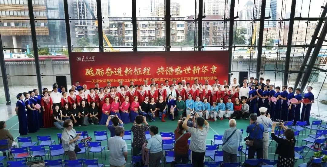 在文艺展演中,退休教职工协会各兴趣组和北洋老年大学各教学班级的老同志们献上了精彩纷呈的节目。退休教职工冯宝平、崔丽担任主持。民乐演奏《喜洋洋》《采茶舞》,迅速掀起喜庆的热潮;藏族舞《毛主席的光辉》,朗诵《祖国万岁》《盛世中国》,独唱《祝酒歌》,抒发了对党和国家的无比热爱;京歌《英雄梦想》,舞蹈《春风十万里》《军人本色》《珊瑚颂》,服饰表演《青青子衿海棠依旧》《秋韵芳华》,朗诵《生如胡杨》,男士模特表演《真秀我型美丽飞扬》,小合唱《祝福祖国》《杏花落》,大合唱《长征组歌》选段《告别》《四渡赤水出奇兵》,精彩纷呈,各展特色,迎来现场老同志和师生的阵阵掌声。最后,退休教职工协会夕阳红合唱团与建筑学院学生合唱团共同上台,与全场观众一起唱响《我和我的祖国》,将演出氛围推上最高潮。