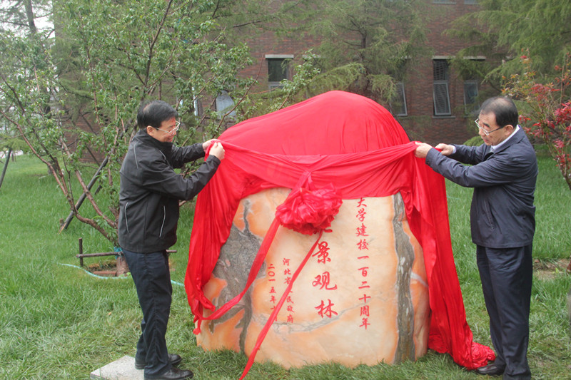 许宁和李家俊为“河北景观林”揭幕。该景观林坐落于天津大学北洋园校区三问桥畔,面积为200平米,包括5棵雪松、3棵蜜桃和5棵红枫。其中红枫树在北方地区比较少见,是名贵的观叶树木。“藉此对天津大学表示感谢,希望再为天津大学增添一道风景”,许宁在捐赠仪式中表示。