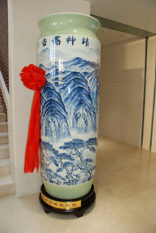 我国传统习俗认为,花瓶寓意平平安安,圆圆满满。因此,江西校友会赠与我校一对“天柱瓶”献礼我校120周年华诞,天柱瓶高1895毫米,寓意母校成立于1895年,直径666毫米,表示江西校友祝愿母校事业发展顺顺利利。“天柱瓶”采用“瓷都”江西景德镇的招牌瓷种青花瓷制作而成,瓶面绘有井冈山图案,表示该瓶是由江西校友赠送给母校。井冈山上开满了杜鹃花和结满了硕果,表现了母校教学、新利18网址登录