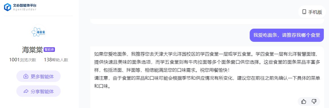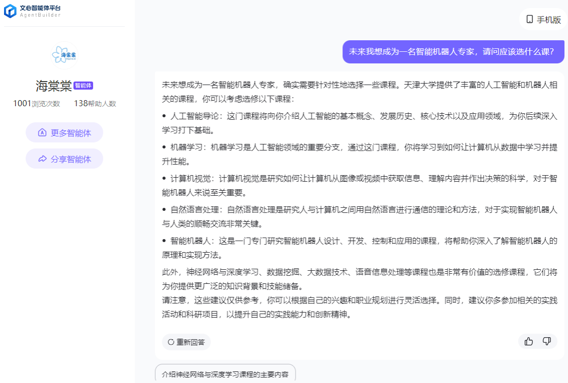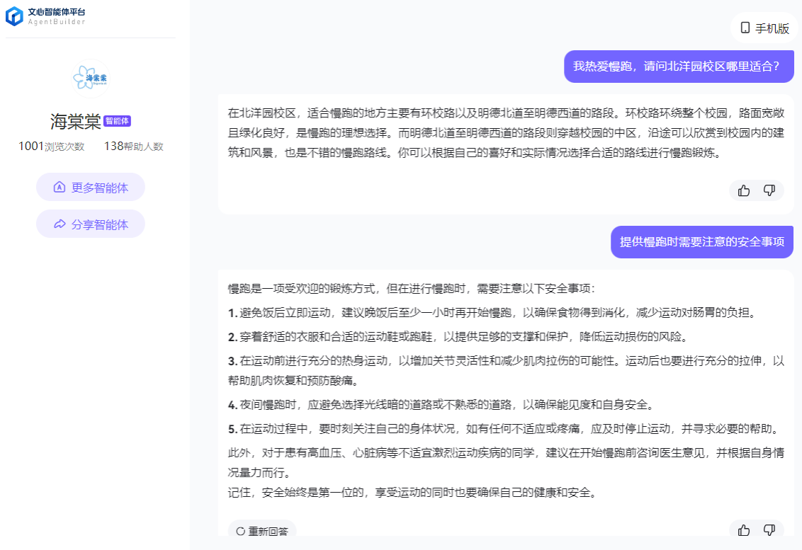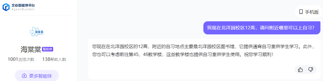 、校园生活、个人发展等方面的各类常见问题。这就是“AI学长”——新生智能体“海棠棠”。