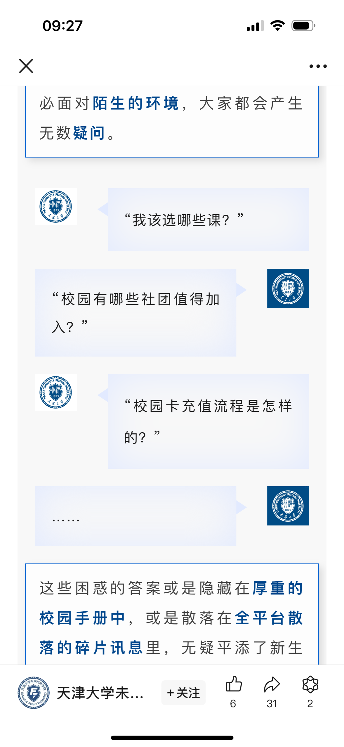 目前“海棠棠”测试版已经上线,未来技术学院的大一新生代利凯同学,在体验了“海棠棠”后表示,“海棠棠”能快速帮助查找到想要的信息,对于刚入学的同学来说,通过这种方式来融入校园非常快。