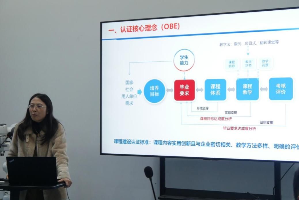 刘艳丽教授以“基于OBE的课程建设”为题,系统阐述了成果导向型教育教学的核心理念以及学院下一阶段针对课程质量提升工作的总体规划和工作重点。刘艳丽强调,课程质量提升是一项系统工程,要在课程内容设计、课程教材建设、课程材料编排等方面均衡发力,特别要在全面实现英文教学、全面加强产教融合实践环节、全面推进AI赋能课程教学等方面下功夫,不断优化课程体系,提高教学质量。