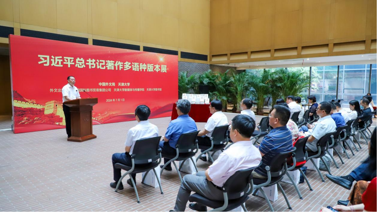 本站讯(新媒体与传播学院供稿)2024年7月1日,“习近平总书记著作多语种版本展”在天津大学开幕,并在北洋园校区郑东图书馆、卫津路校区科学图书馆同步展出,成为了天大师生一次极富纪念意义的党日活动。中国外文局副局长、当代中国与世界研究院院长于运全,外文出版社总编辑许荣,天津市委宣传部副部长徐中,中国外文局综合业务部主任辛峰,中国国际图书贸易集团公司副总经理杨英姿,天津大学党委书记杨贤金,党委常委、宣传部部长杨欢,党委常委、统战部部长、人文社科处处长张俊艳等出席开幕式。仪式由天津大学党委副书记韩庆华主持。
